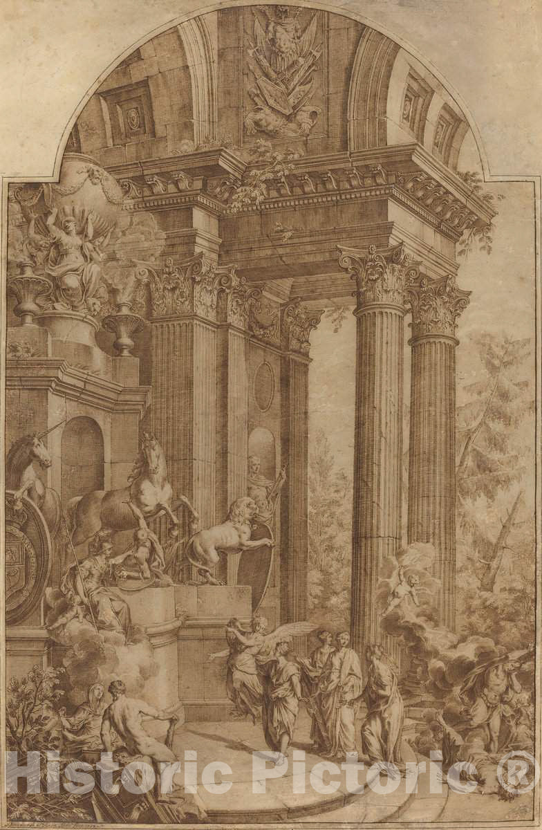 Artist: Domenico Maria Fratta | Drawing: Monument to King George I | Original Medium: pen and brown ink over traces of black chalk, heightened with white on prepared paper; partially pricked for transfer