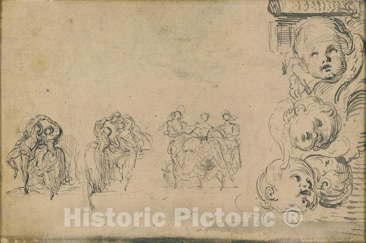 Art Print : Gabriel Jacques de Saint-Aubin, Sketches of Dancers and Heads of Putti, 1748 - Vintage Wall Art
