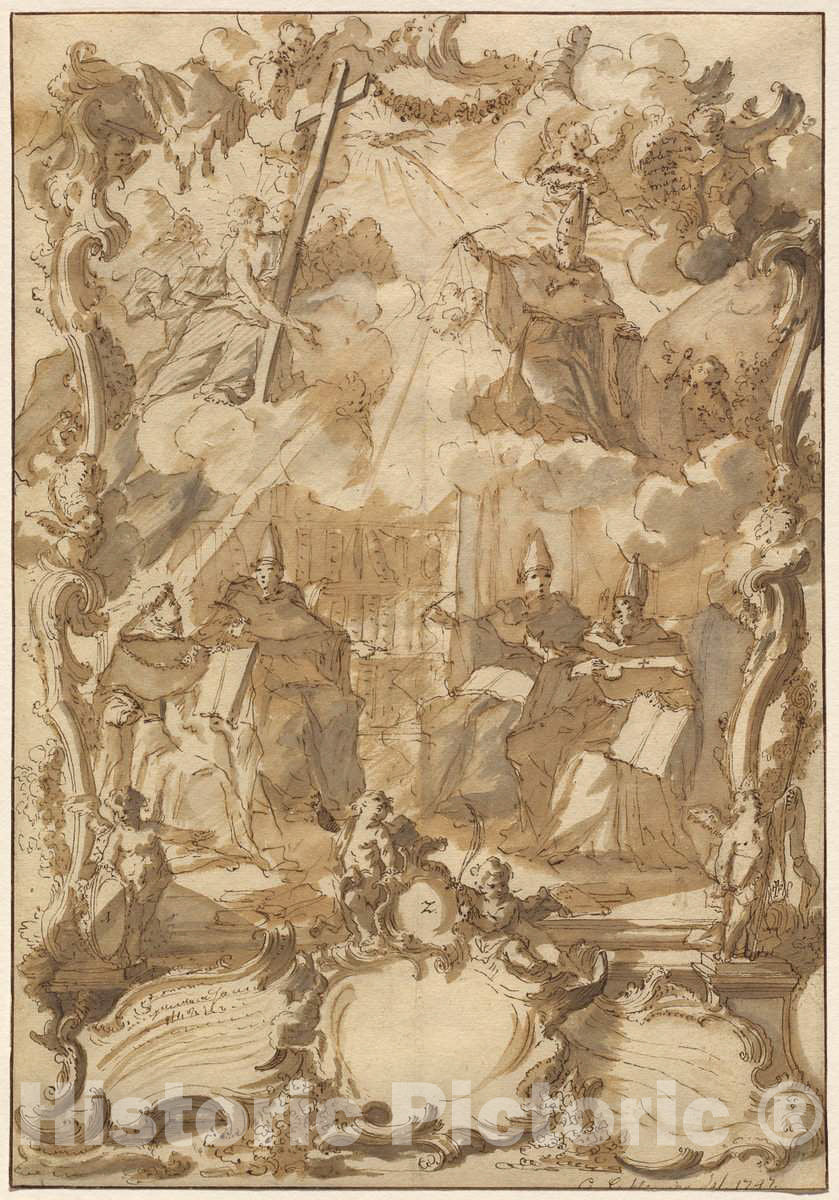 Art Print : Gottfried Eichler The Younger, A Thesis Design with Doctors of The Church, 1747 - Vintage Wall Art