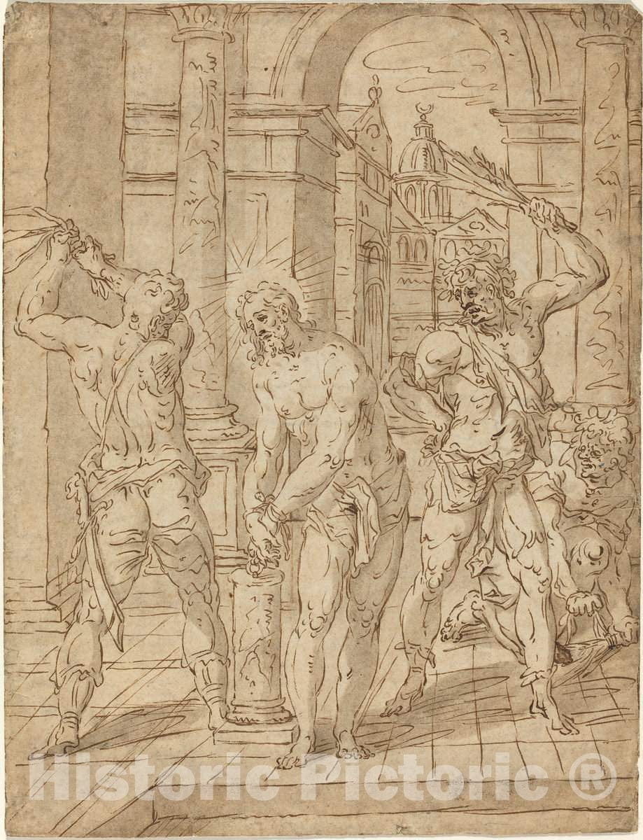 Artist: Flemish 17th Century after Hendrik de Clerck | Drawing: The Flagellation of Christ | Original Medium: pen and brown ink with brown wash on laid paper