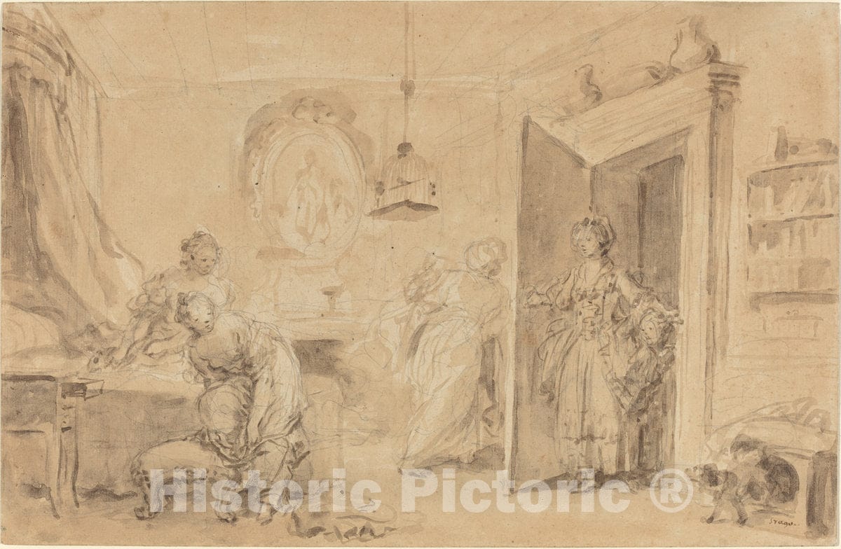 Artist: Jean-Honor? Fragonard | Drawing: The Bedroom (Le Coucher or Ma Chemise brule) | Original Medium: brush and brown ink with brown wash over graphite on laid paper