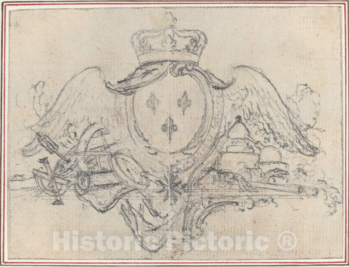 Artist: Hubert Franois Gravelot | Drawing: Arms of the King of France with Wings and Scientific Instruments | Original Medium: graphite, incised for transfer on laid paper; laid down