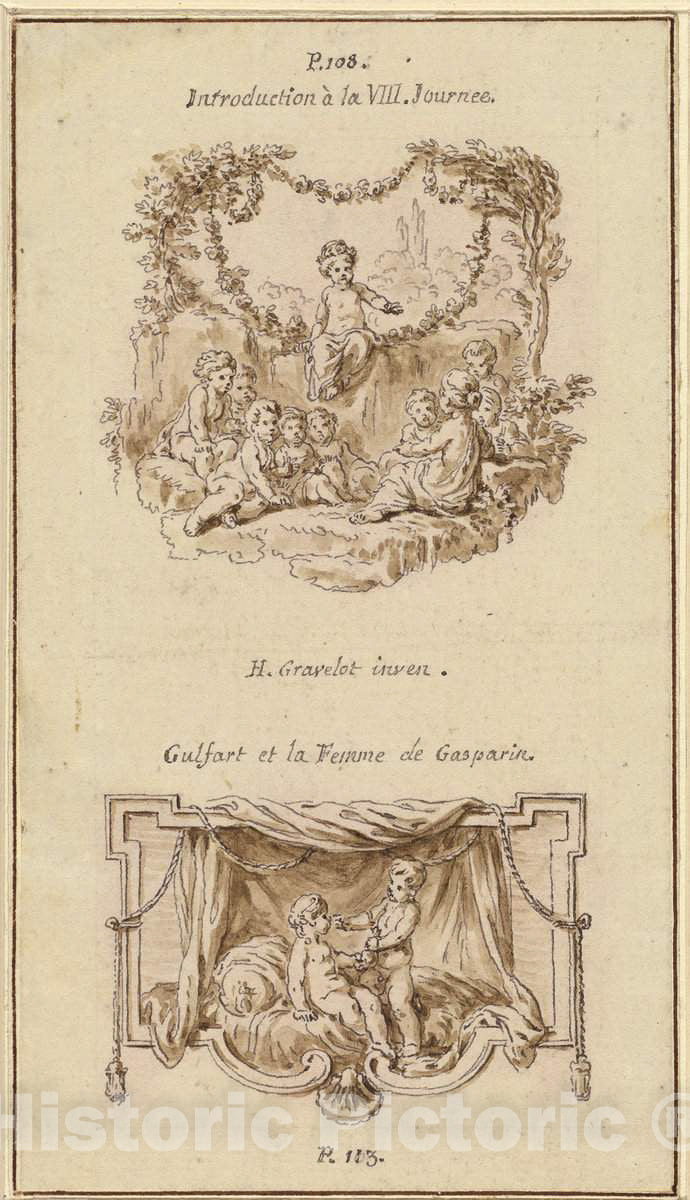 Artist: Hubert Franois Gravelot | Drawing: Nine Children Listening to a Girl Tell a Story; A Boy Handing a Purse to a Girl Seated on a Bed | Original Medium: pen and gray ink with brown wash on laid paper