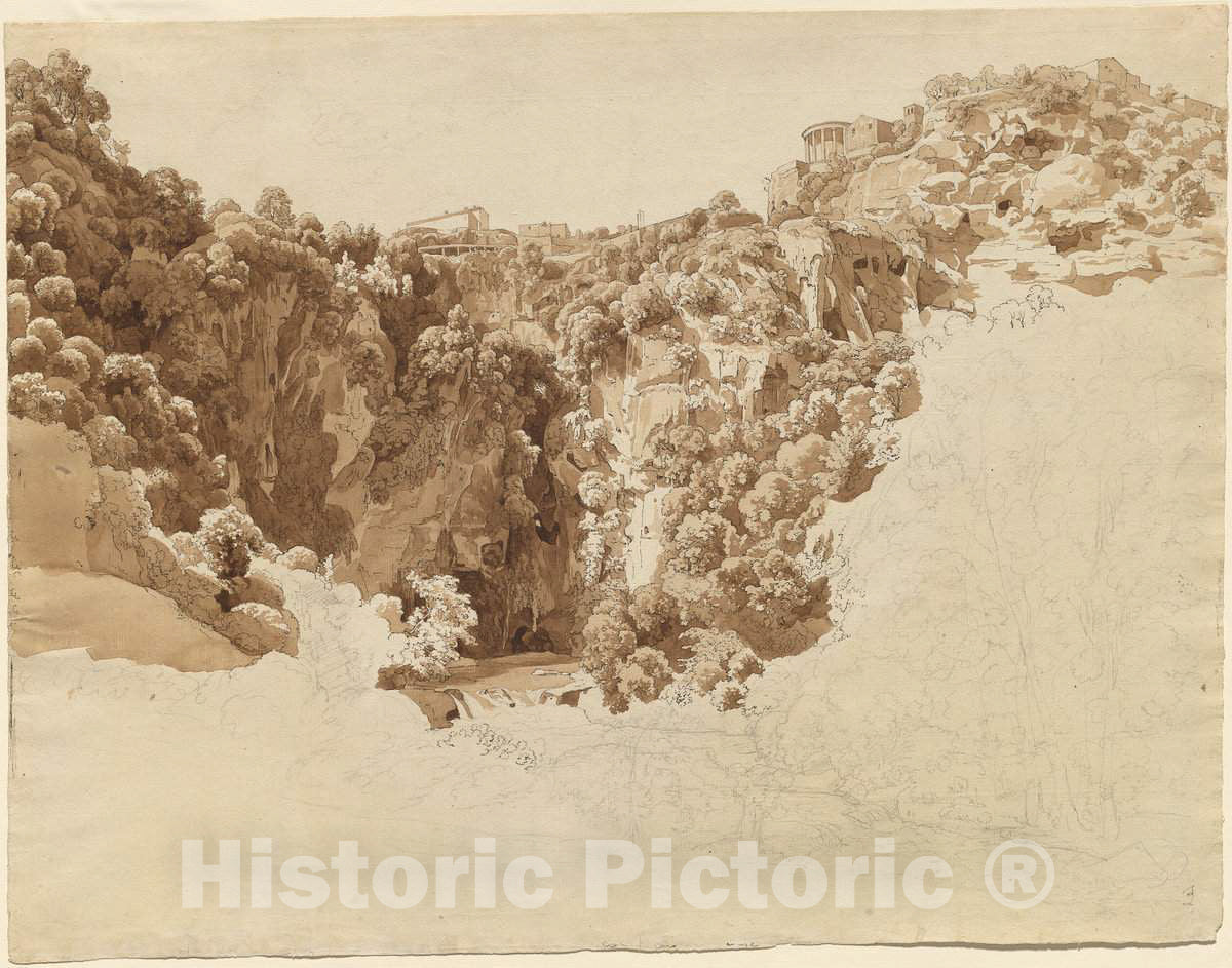 Artist: Johann Christian Reinhart | Drawing: Tivoli and the Temple of the Sibyl above the Aniene Gorge | Original Medium: pen and black ink with brown wash over graphite on laid paper
