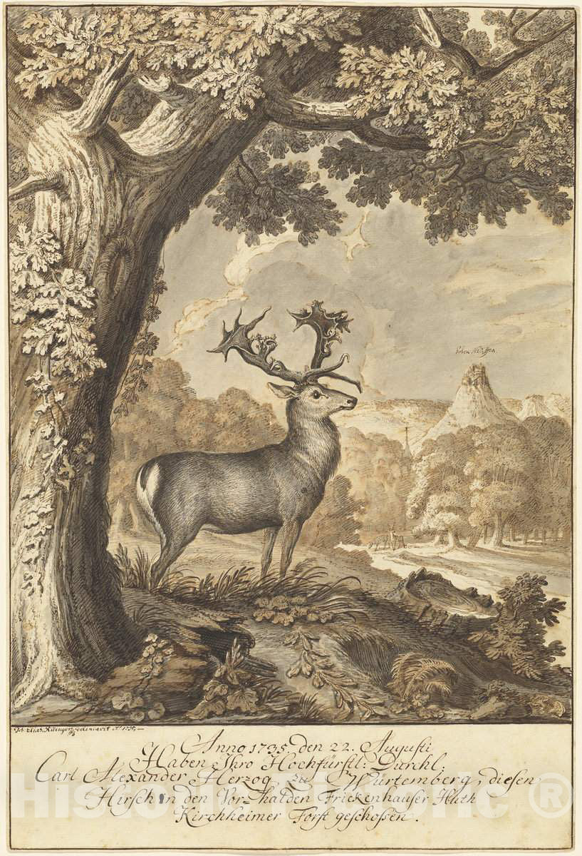 • .Art Print : Johann Elias Ridinger, A Stag Beneath a Mighty Oak, 1735 - Vintage Wall Art