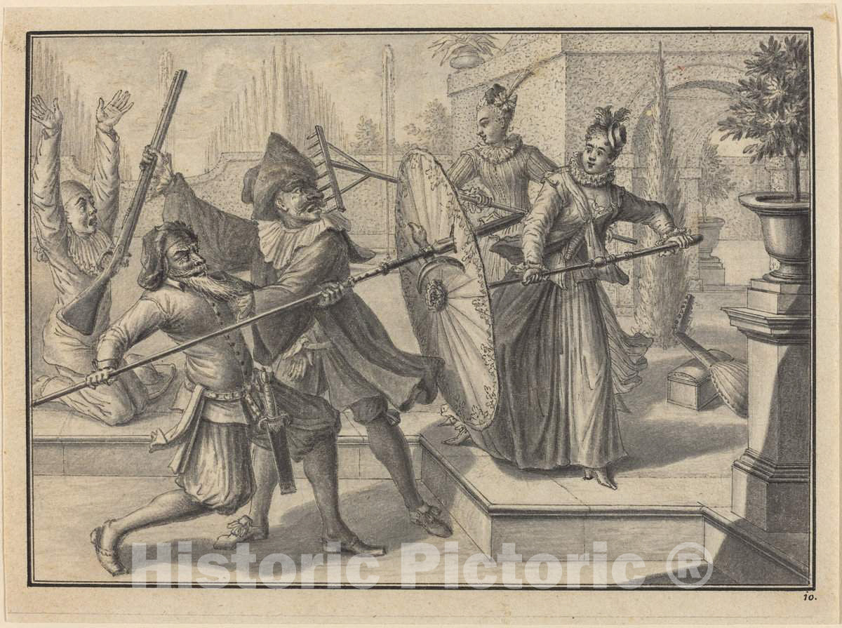 Art Print : Johann Jacob Schübler, Pantaloon and The Doctor Fighting with Columbine and Brigatella in The Garden, c. 1729 - Vintage Wall Art