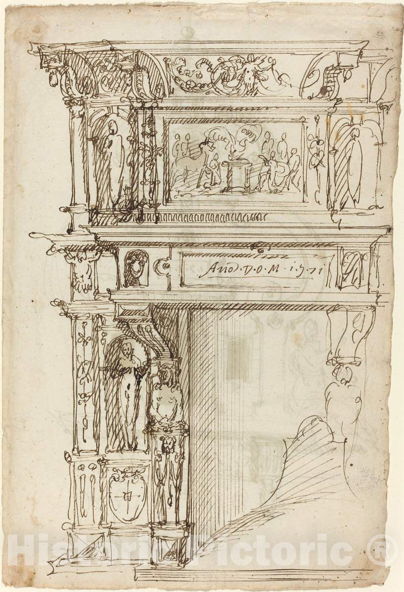 Art Print : Palatial Mantelpiece with a Scene of Ancient Sacrifice [Recto], 1571 - Vintage Wall Art