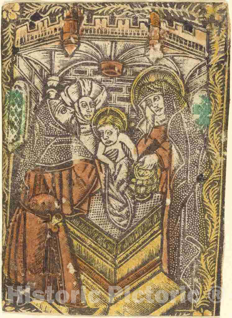 Artist: Workshop of Master of the Borders with the Four Fathers of the Church | Print: The Presentation in the Temple | Original Medium: metalcut, hand-colored in yellow, red-brown lake, and green