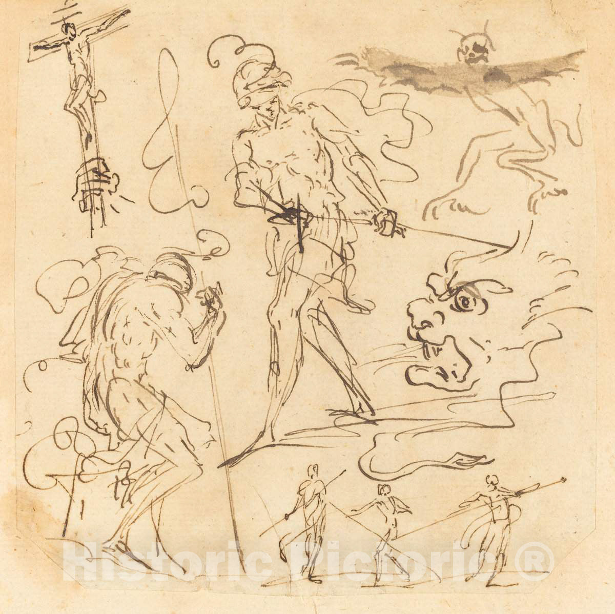 • .Art Print : Sheet of Studies with a Soldier Drawing a Sword, a Crucifix, Monstrous Animals, and Other Figures - Vintage Wall Art