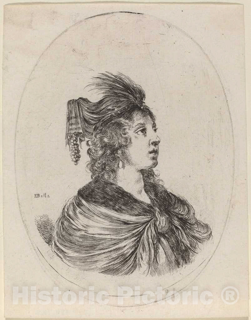 Art Print : Stefano Della Bella, Woman in a Feathered Turban, Turned to The Right, c.1650 - Vintage Wall Art