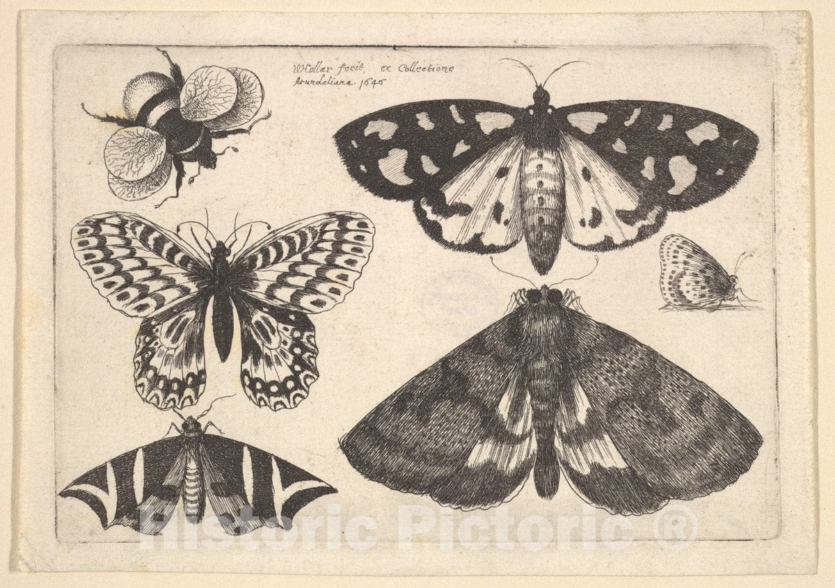 • .Art Print : Wenceslaus Hollar, Three Moths, Two Butterflies, and a Bumble Bee, 1646 - Vintage Wall Art