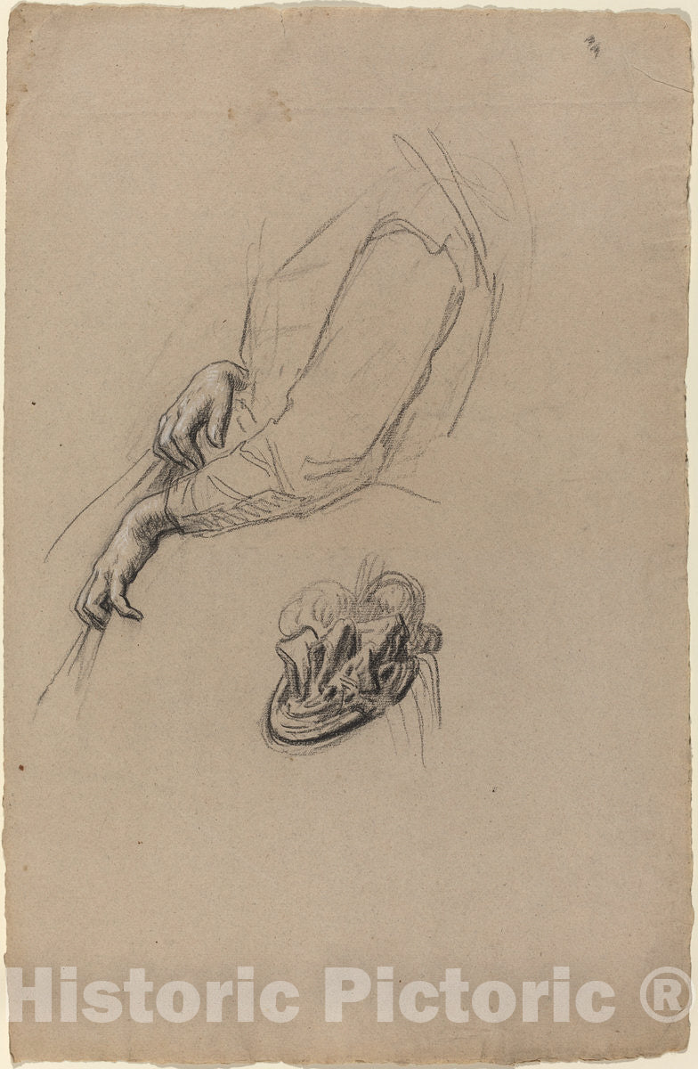 Artist: French 19th Century | Drawing: Young Woman's Hands and Beribboned Hat | Original Medium: black chalk heightened with white chalk on buff laid papaer