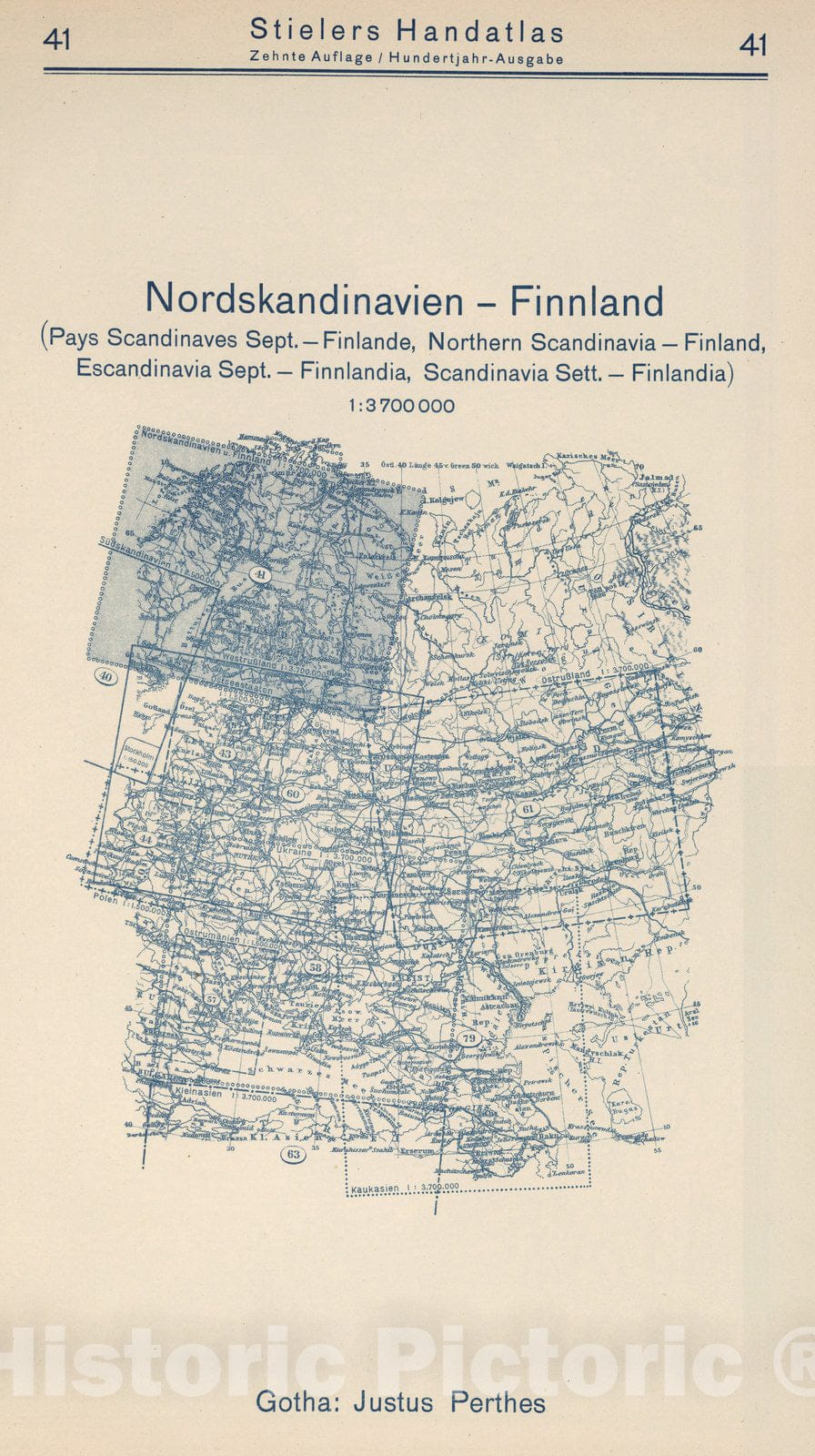 (Index Map) 41. Nordskandinavien - Finnland. North Scandinavia - Finland. | Stieler's Atlas of Modern Geography. 254 Maps & Insets on 108 Sheets Engraved on Copper. Tenth (Centenary) Edition. Completely Revised & Largely Redrawn under the Direction of Professor H. Haack in Justus Perthes' Geogr. Institute. (in two parts). 1925. Gotha: Justus Perthes. | Two volume set in English. 10th edition and the Centenary edition. This edition was a very important revision and was issued in German, French, English, Spanish, and Italian. Each map preceded by index map, printed in blue, which is labeled, "Stielers Handatlas, Zehnte Auflage / Hundertjahr-Ausgabe. Gotha: Justus Perthes." Relief shown in hachures. Alphabetical Index of place names not scanned. Over 43 different draftsmen and engravers are listed on the various sheets.