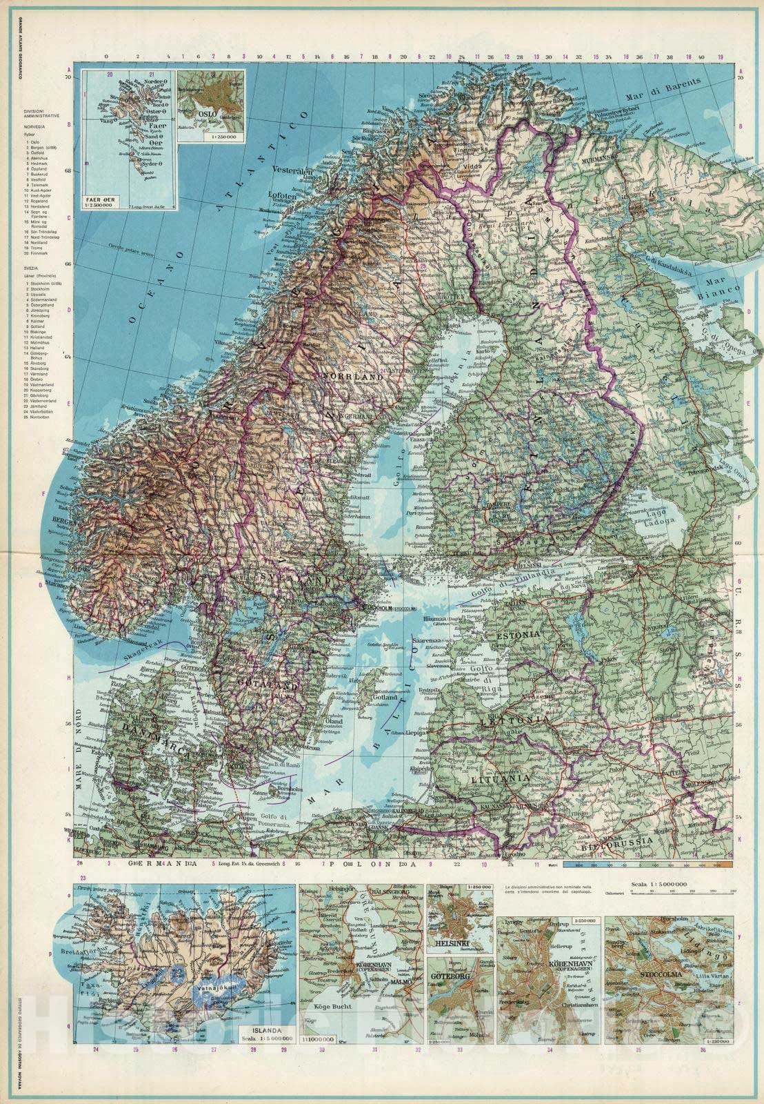 Historic Map : Lithuania; Estonia; Latvia; Iceland, Baltic Sea 1952 Paesi Scandinavi Finlandia. , Vintage Wall Art