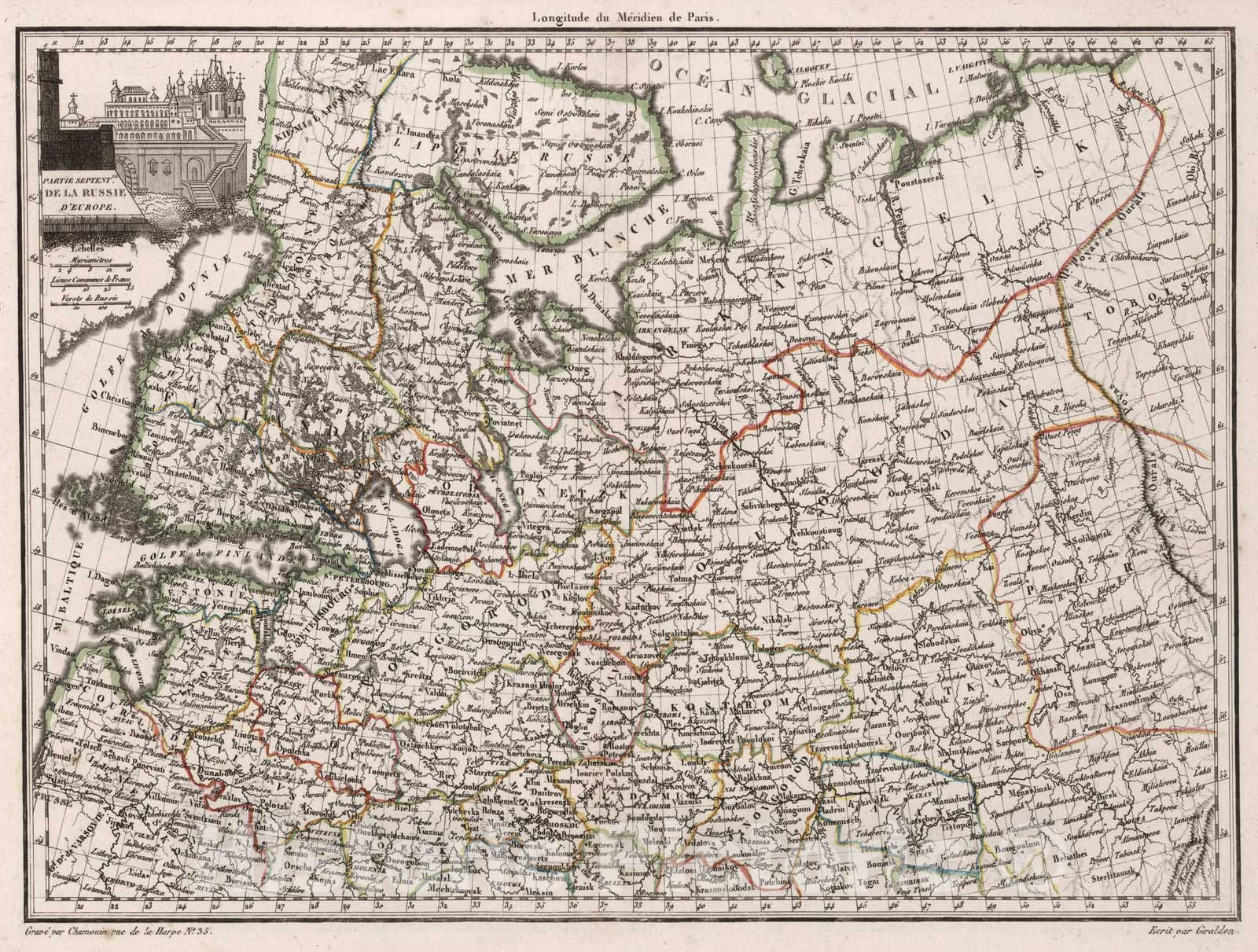 Partie Septentle. de la Russie d'Europe. | Atlas Complet Du Precis De La Geographie Universelle De M. Malte-Brun; Dresse Conformement Au Texte De Cet Ouvrage Et Sous Les Yeux De L'Auteur, Par M. Lapie, Capitaine Ingenieur Geographe. (Cet Atlas est forme de 75 Cartes.) A Paris, Chez Francois Buisson, Libraire-Editeur, Rue Gilles-Coeur, No. 10. 1812. | These maps have beautiful cartouches and hand painted outline color. Lapie made the maps. 1st edition. This atlas is up to date: the North America map shows the Lewis and Clark information and Lewis and Clark are discussed in the text explaining the map. In French. Relief shown in hachures or sketches. Extraordinary unique vignettes used for framing the title of each map.