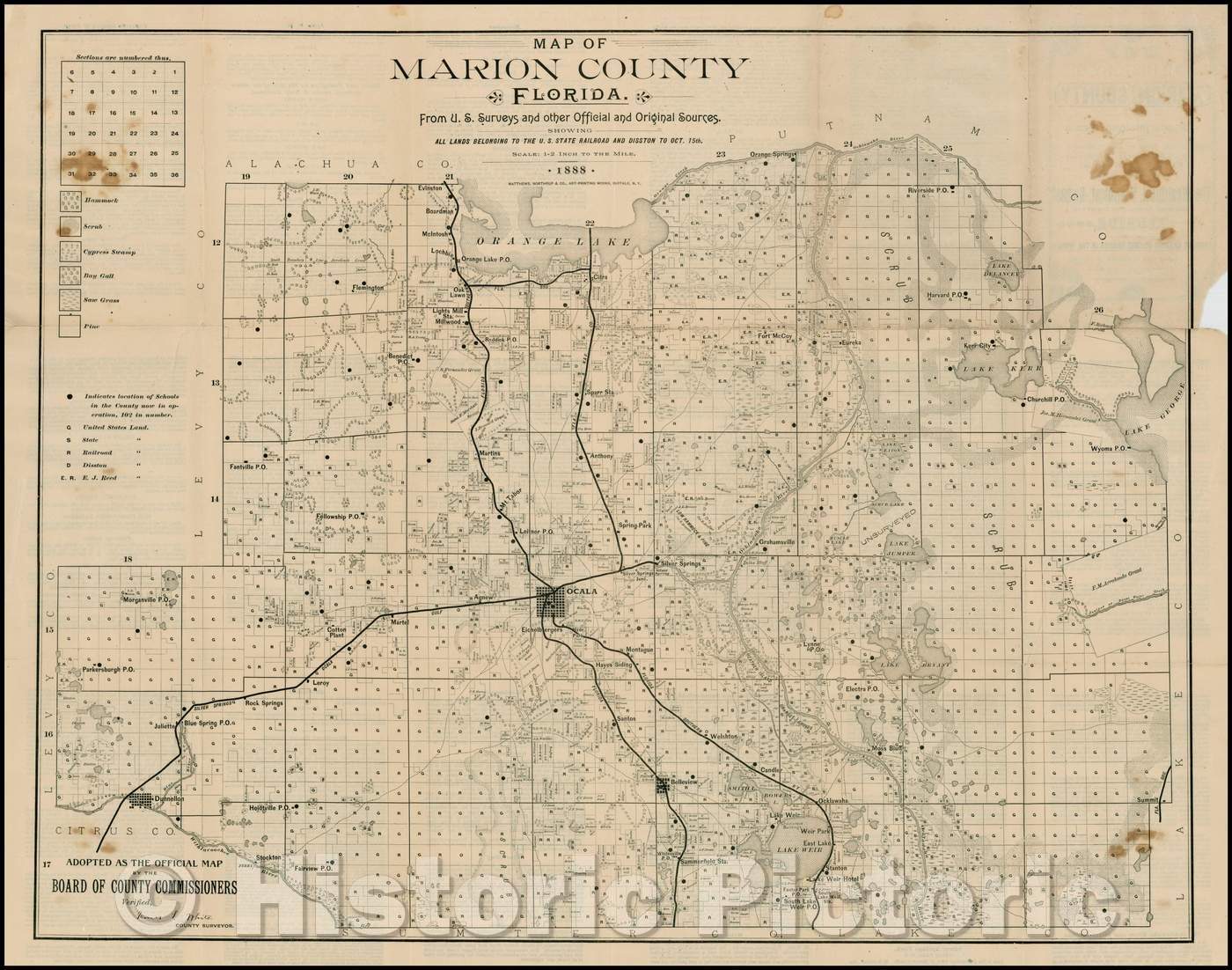 Historic Map - of Marion County Florida. From U.S. Surveys and other Official and Original Sources. Showing All Lands Belonging To The U.S. State Railroad, 1888 - Vintage Wall Art