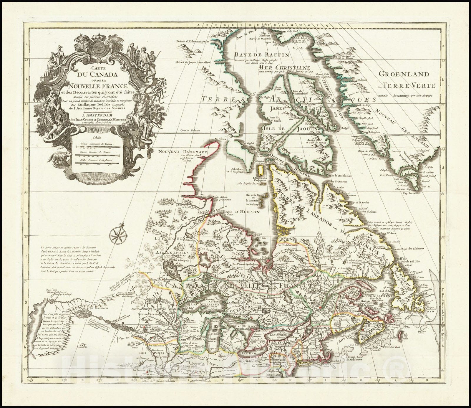 • .Historic Map : Carte Du Canada ou de la Nouvelle France et des Decouvertes qui y ont ete faites,  1730, Vintage Wall Art