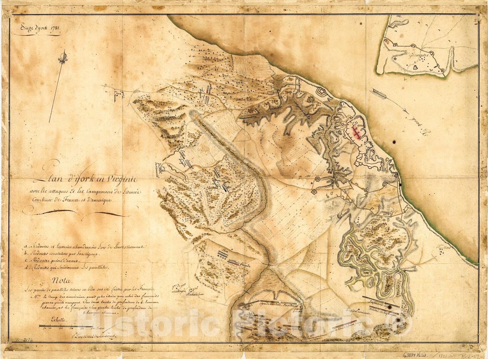 • Historic 1781 Map - Siege d'York, 1781. Plan d'York en Virginie avec les attaques et les campemens de l'Armée combinée de France et d'Amérique.