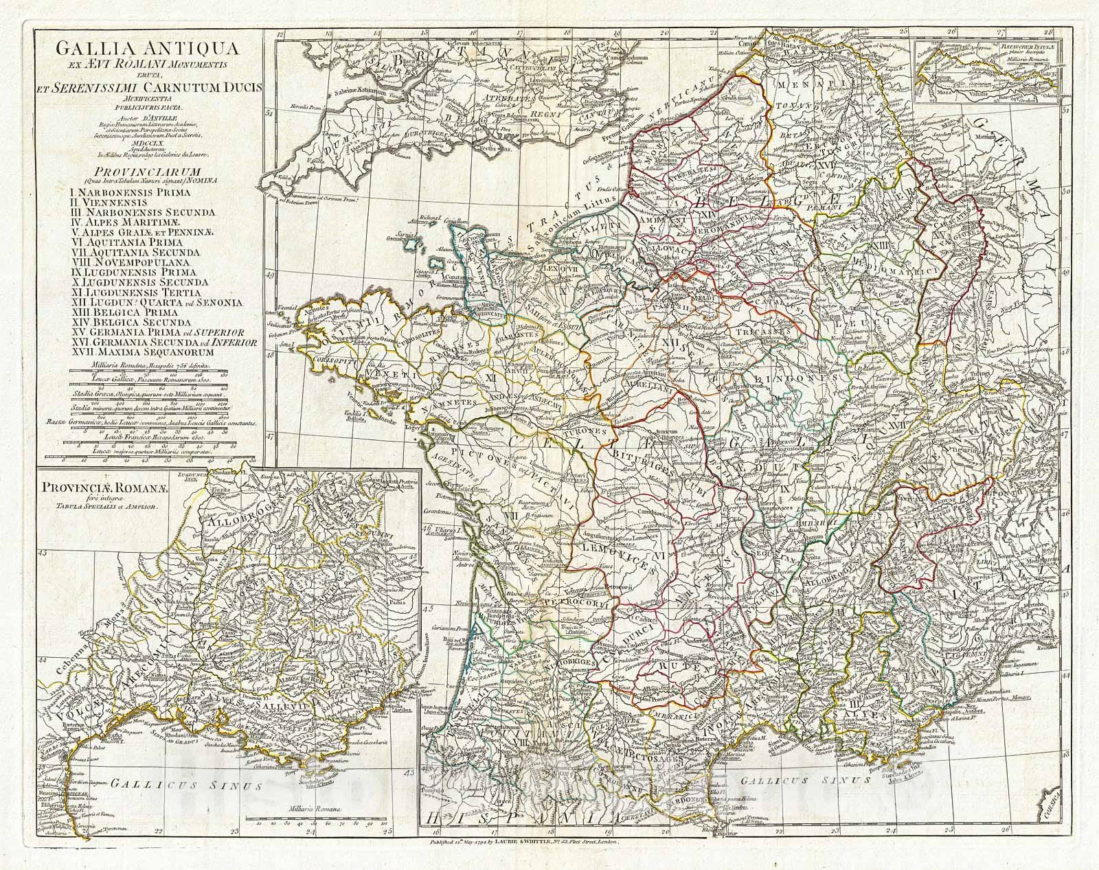 A large and dramatic J. B. B. D'Anville map of Gallia or France in ancient Roman times. Covers from the southern part of England (Britannia) to the Pyrenees and the Mediterranean. Details mountains, rivers, cities, roadways, and lakes with political divisions highlighted in outline color. Features both ancient and contemporary place names, ie. Parisii and Paris, for each destination - an invaluable resource or scholars of antiquity. An inset in the lower left quadrant details Gallia's southern most Roman Provinces. A smaller inset labeled Batavorum Insulae appears in the upper right quadrant. Title area in upper left quadrant. Includes seven distance scales, top left, referencing various measurement systems common in antiquity. Text in Latin and English. Drawn by J. B. B. D'Anville in 1762 and published in 1794 by Laurie and Whittle, London.