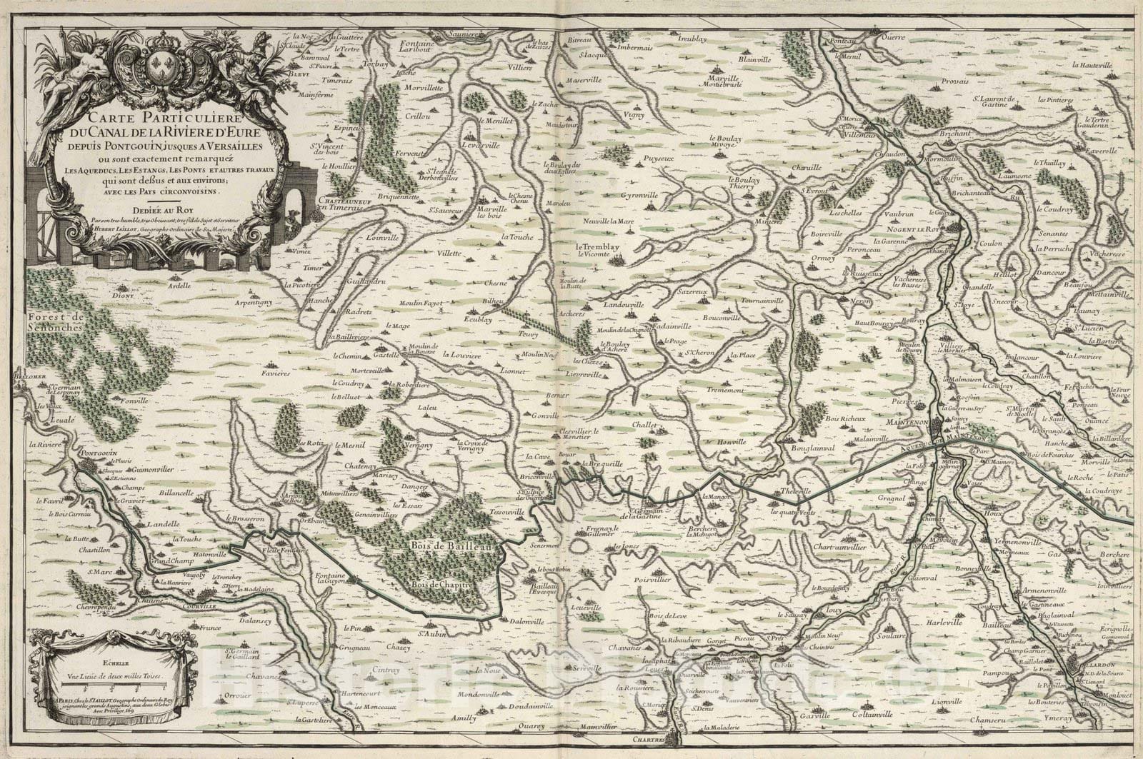 Historic Map : Aqueduct of Maintenon, France 1695 Canal de la Riviere d'Eure depuis Pontgouin, jusques a Versailes (western sheet). , Vintage Wall Art