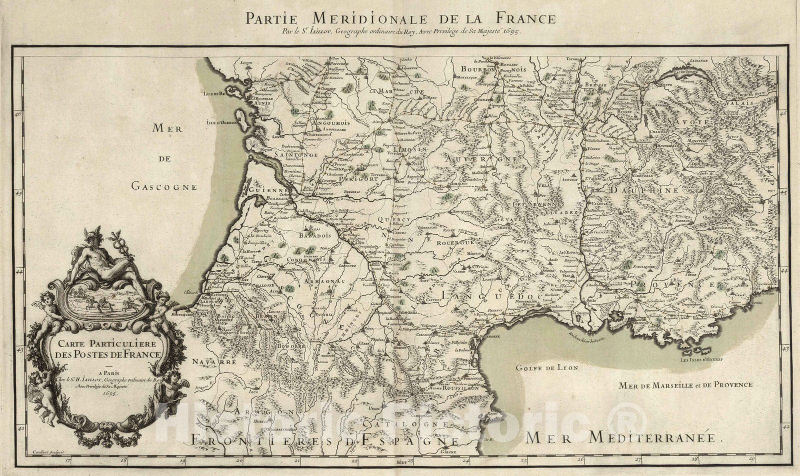 Historic Map : France, 1695 Partie Meridionale de la France (southern sheet). Carte Particulaire de Postes de France. , Vintage Wall Art