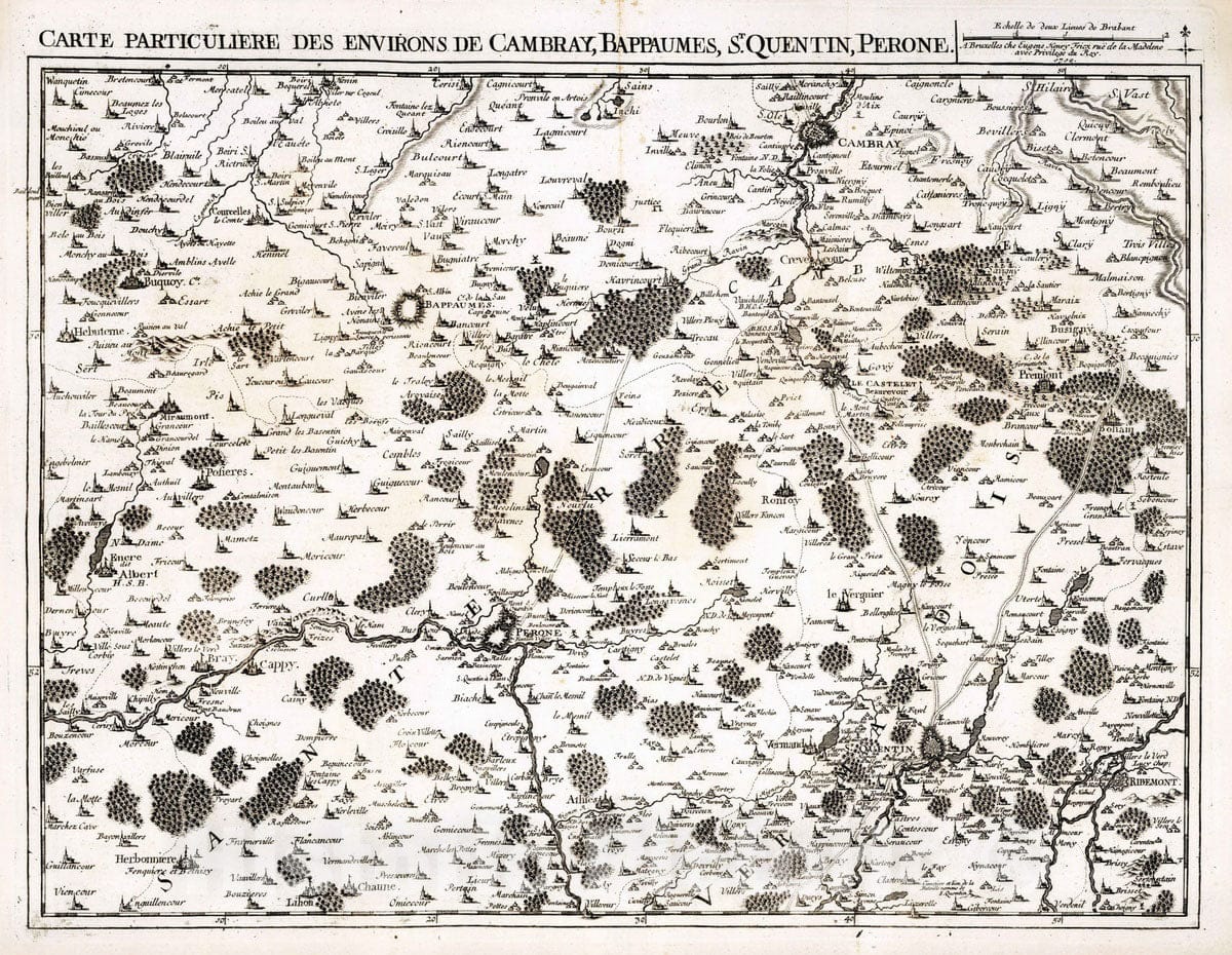 Historic Map : France, 1710 21. Carte particuliere des environs de Cambray, Bappaumes, St. Quentin, Perone, c. 1710. , Vintage Wall Art
