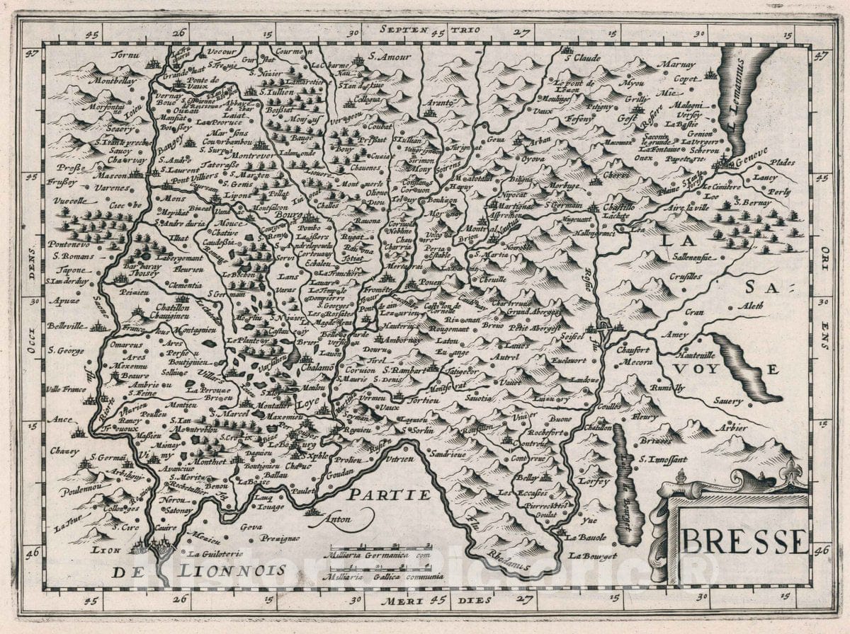 Historic Map : France, Bresse Region , France Bresse. Atlas sive Cosmographicae Meditationes de Fabrica Mundi et fabricati Figura, 1636 Atlas , Vintage Wall Art