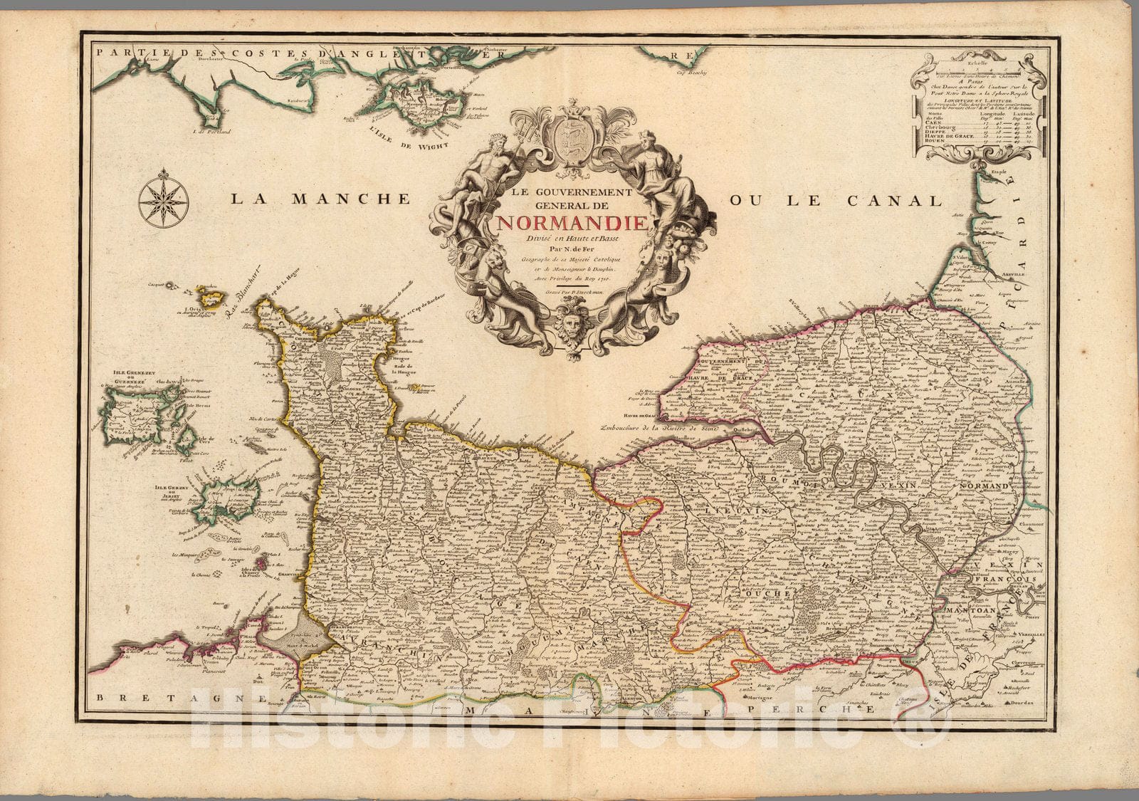 • .Historic Map : France, Normandie , FranceLe Gouvernment General De Normandie. 1710 , Vintage Wall Art