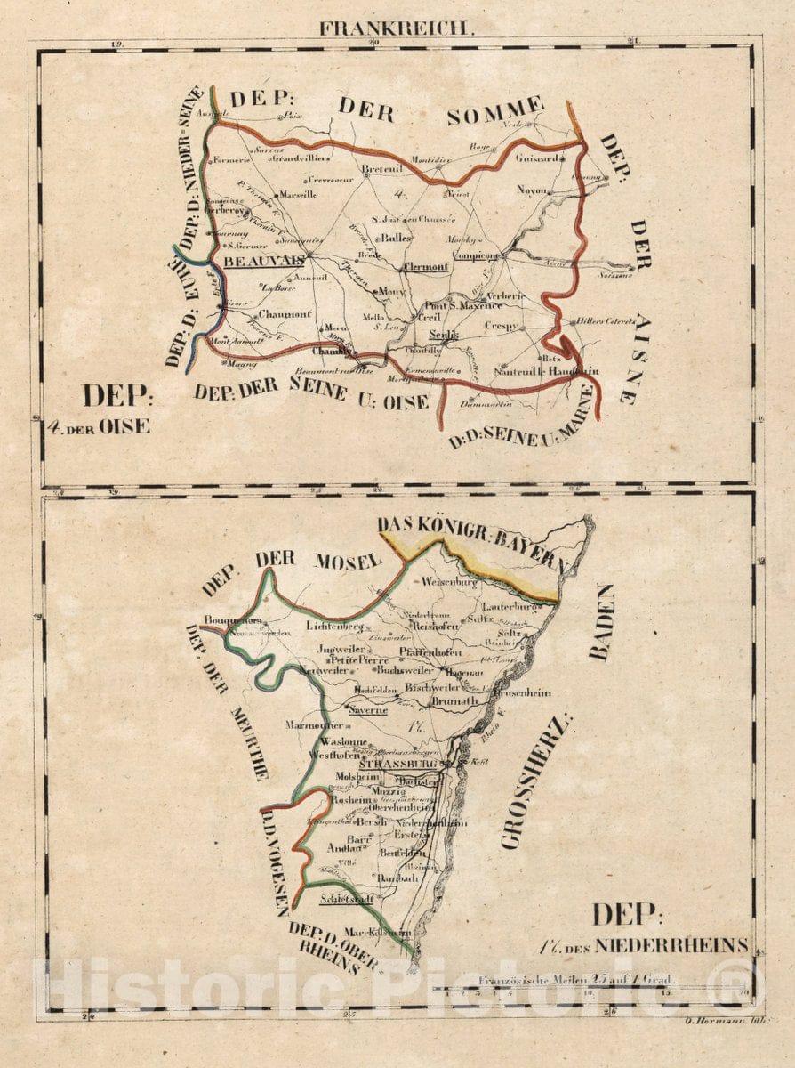 Frankreich. DEP: 4. Der Oise. (with) DEP: 17. Niederrheins. O. Hermann Lith. (to accompany) Atlas von Europa nebst den Kolonien : bearbeitet von W. E. A. v. Schlieben ... Leipzig bei Georg Joachim Goschen 1825. | Atlas von Europa nebst den Kolonien : fur Geschaftsmanner, Zeitungsleser und Besitzer des Conversations-Lexicons in einer Folge von Charten und einem alphabetisch eingerichteten Texte : bearbeitet von W. E. A. v. Schlieben ... Leipzig bei Georg Joachim Goschen 1825. O. Hermann, Lith. | Publisher:Georg Joachim Goschen