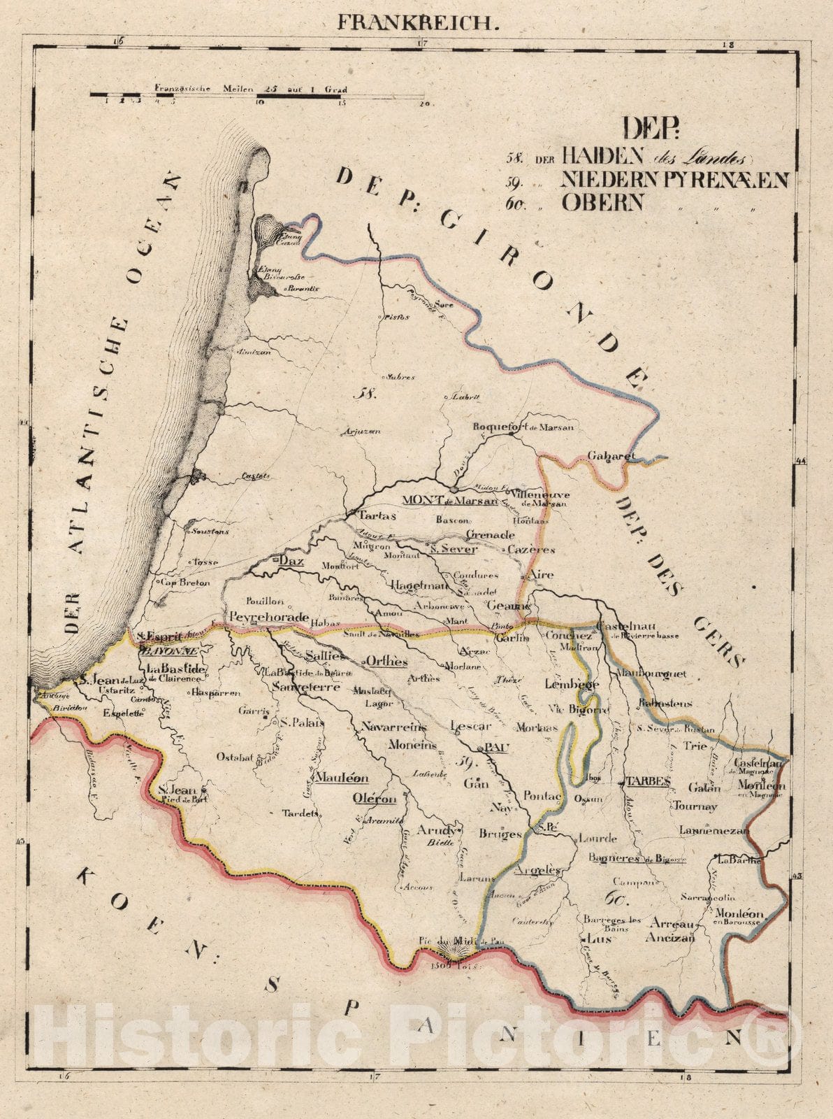 • Historic Map : France, V.1:1-5: I: Frankreich. DEP: 58. Der Haiden des Landes. 59. Niedern Pyrenaeen. 60. Obern 1825 , Vintage Wall Art