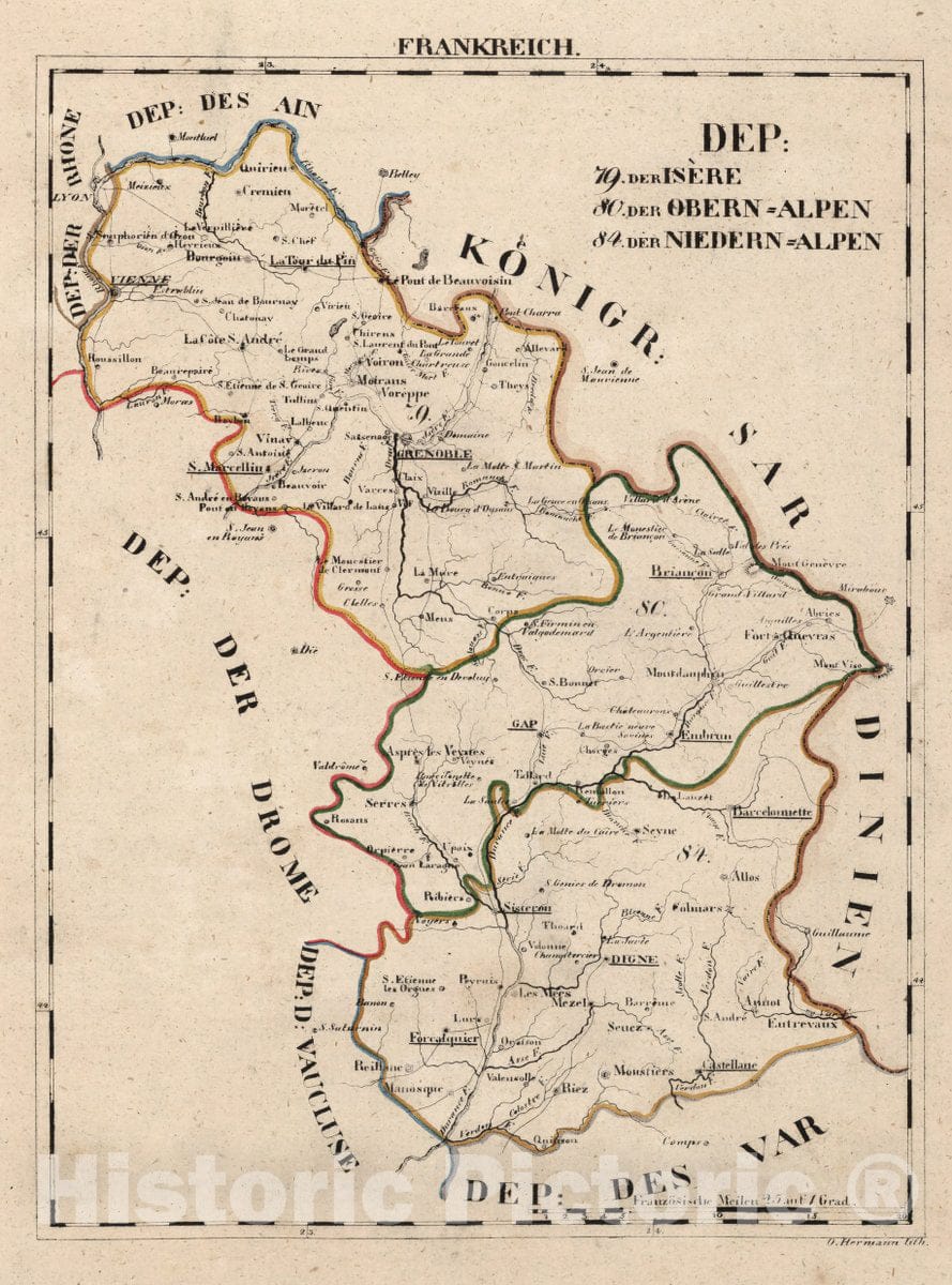 Historic Map : France, V.1:1-5: I Frankreich. DEP: 79. Der Isere. 80. Der Obern = Alpen. 84. Der Niedern = Alpen, 1825 Atlas , Vintage Wall Art