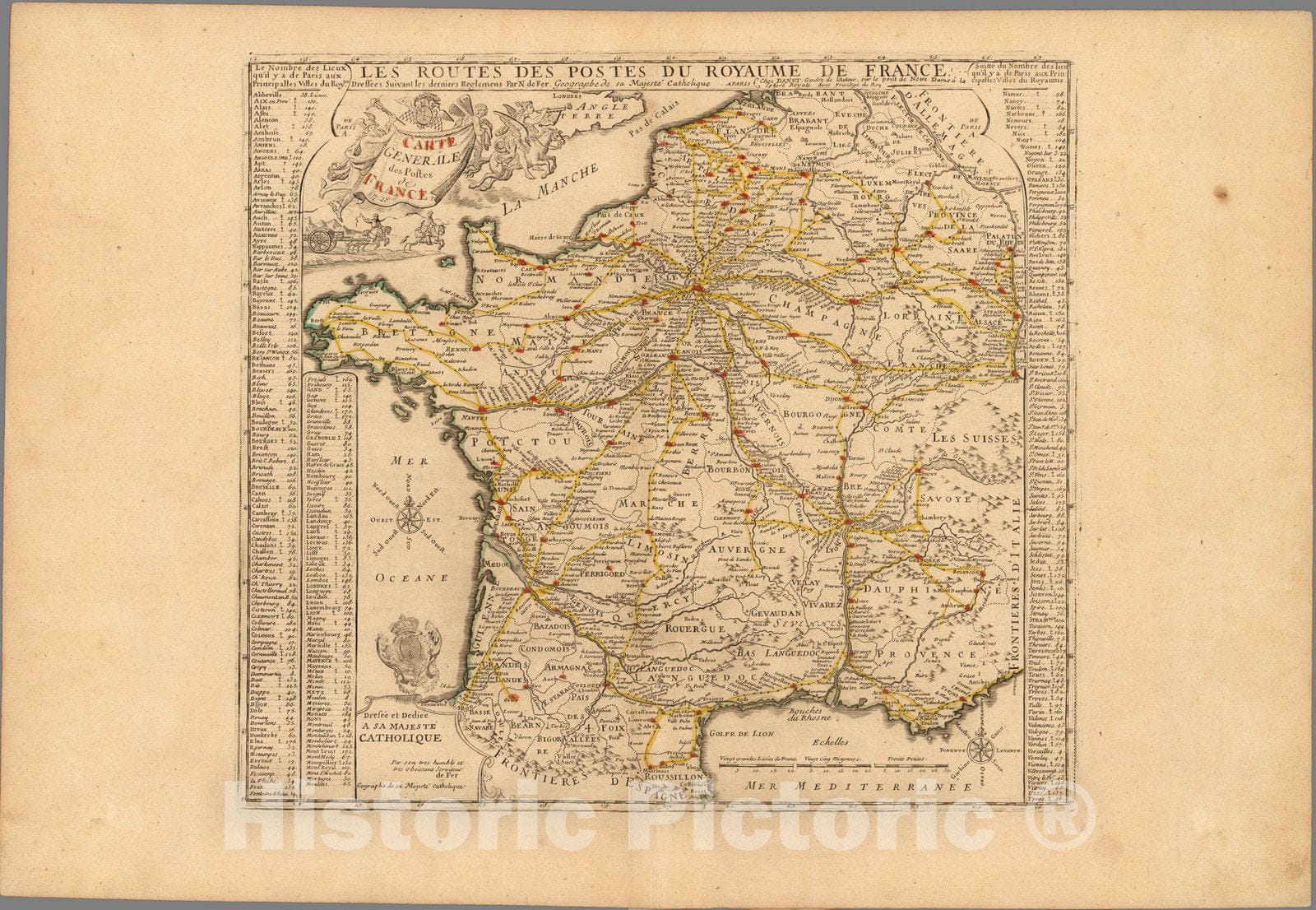 Historic Map : France,Carte General des Postes de France. 1728 , Vintage Wall Art