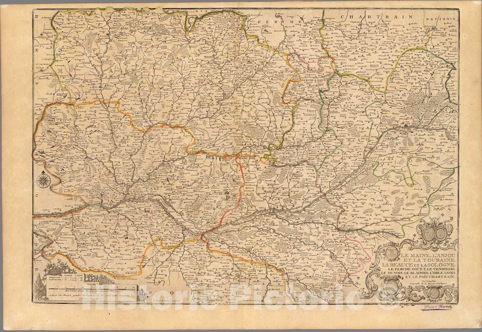 Le Maine, L'Anjou et La Touraine, La Beauche et La Sologne .... | Atlas ou Recueil de Cartes Geographiques Dressees Sur les Nouvelles Observations de Mrs. de L'Academie Royale des Sciences Par N. de Fer, Geographe de sa Majeste Catolique et de Monseigneur le Dauphin. A Paris chez l'Auteur dans l'Isle du Palais sur le Quay de l'Orloge a la Sphere Royal, avec privilege du Roy 1709. | Pastoureau describes this large atlas as De Fer's folio atlas. It is described by De Fer in his catalog of 1716 as his highly detailed atlas showing all parts of the world, with all the maps available separately. The collation of the atlas seems to vary by copy - our copy has a title page but no table of contents. Our copy collates to parts of Pastoueau FER II C - FER II D, with our latest map dated 1748. The maps range in date from 1690 to 1748 with most of the maps in the 1700 to 1720 period. All maps are numbered in manuscript. Of special note in our copy is the two sheet map of the Mississippi River which is rare to find with both north and south sheets present.