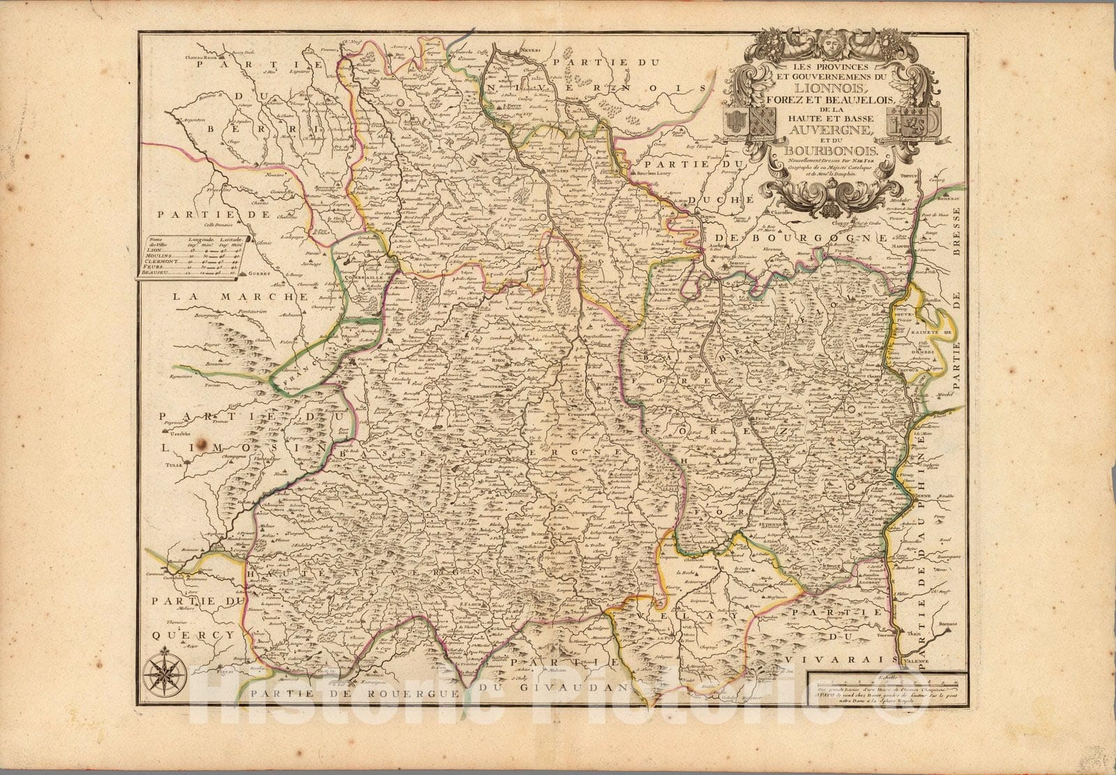 Les Provinces et Gouvernemens Du Lionnois .... | Atlas ou Recueil de Cartes Geographiques Dressees Sur les Nouvelles Observations de Mrs. de L'Academie Royale des Sciences Par N. de Fer, Geographe de sa Majeste Catolique et de Monseigneur le Dauphin. A Paris chez l'Auteur dans l'Isle du Palais sur le Quay de l'Orloge a la Sphere Royal, avec privilege du Roy 1709. | Pastoureau describes this large atlas as De Fer's folio atlas. It is described by De Fer in his catalog of 1716 as his highly detailed atlas showing all parts of the world, with all the maps available separately. The collation of the atlas seems to vary by copy - our copy has a title page but no table of contents. Our copy collates to parts of Pastoueau FER II C - FER II D, with our latest map dated 1748. The maps range in date from 1690 to 1748 with most of the maps in the 1700 to 1720 period. All maps are numbered in manuscript. Of special note in our copy is the two sheet map of the Mississippi River which is rare to find with both north and south sheets present.