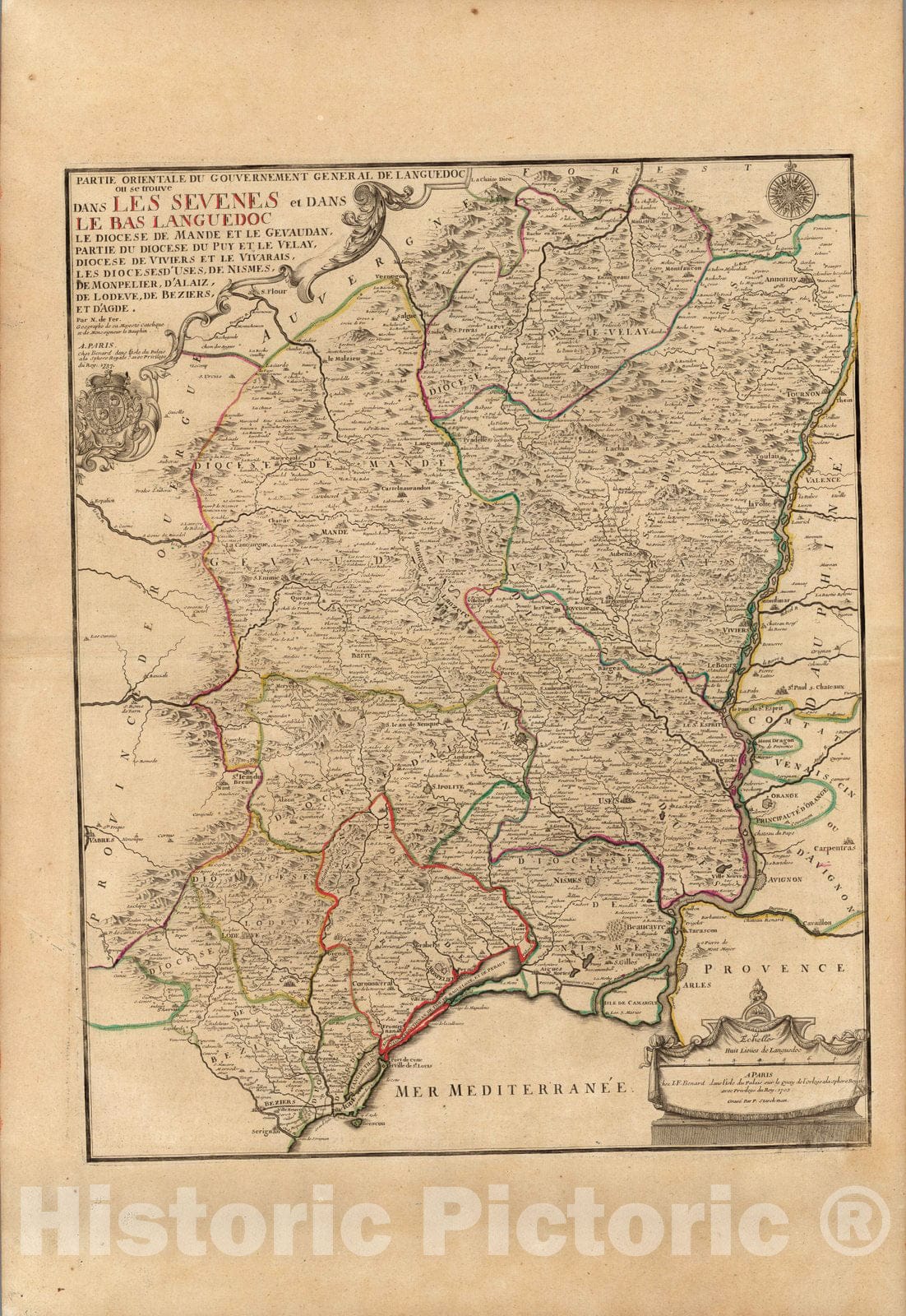 • .Historic Map : France,Parie Orientale Du Gouvernement General De Languedoc 1703 , Vintage Wall Art