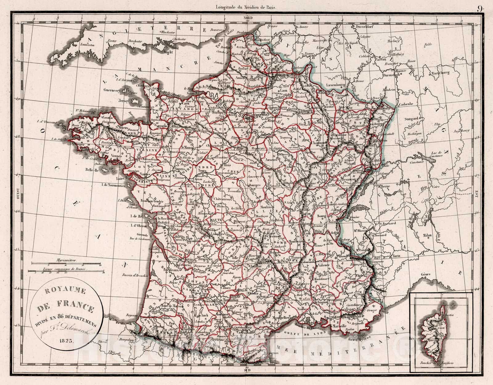 • .Historic Map : France,Royaume de France Divise en 86 Departmens 1825. 1826 , Vintage Wall Art
