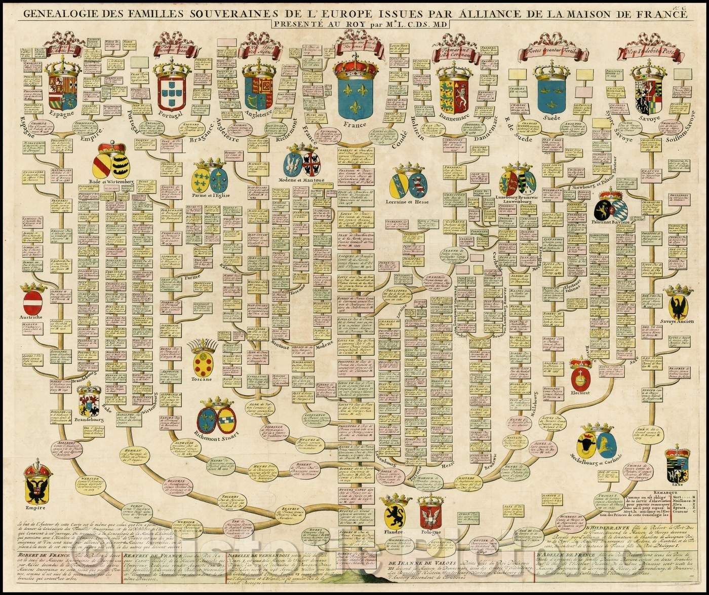 • .Historic Map - Genealogie Des FAmilles Suveraines De L'Europe,Alliances De La Maison De Franc :: Genealogical tree,house of France, 1719 - Vintage Wall Art