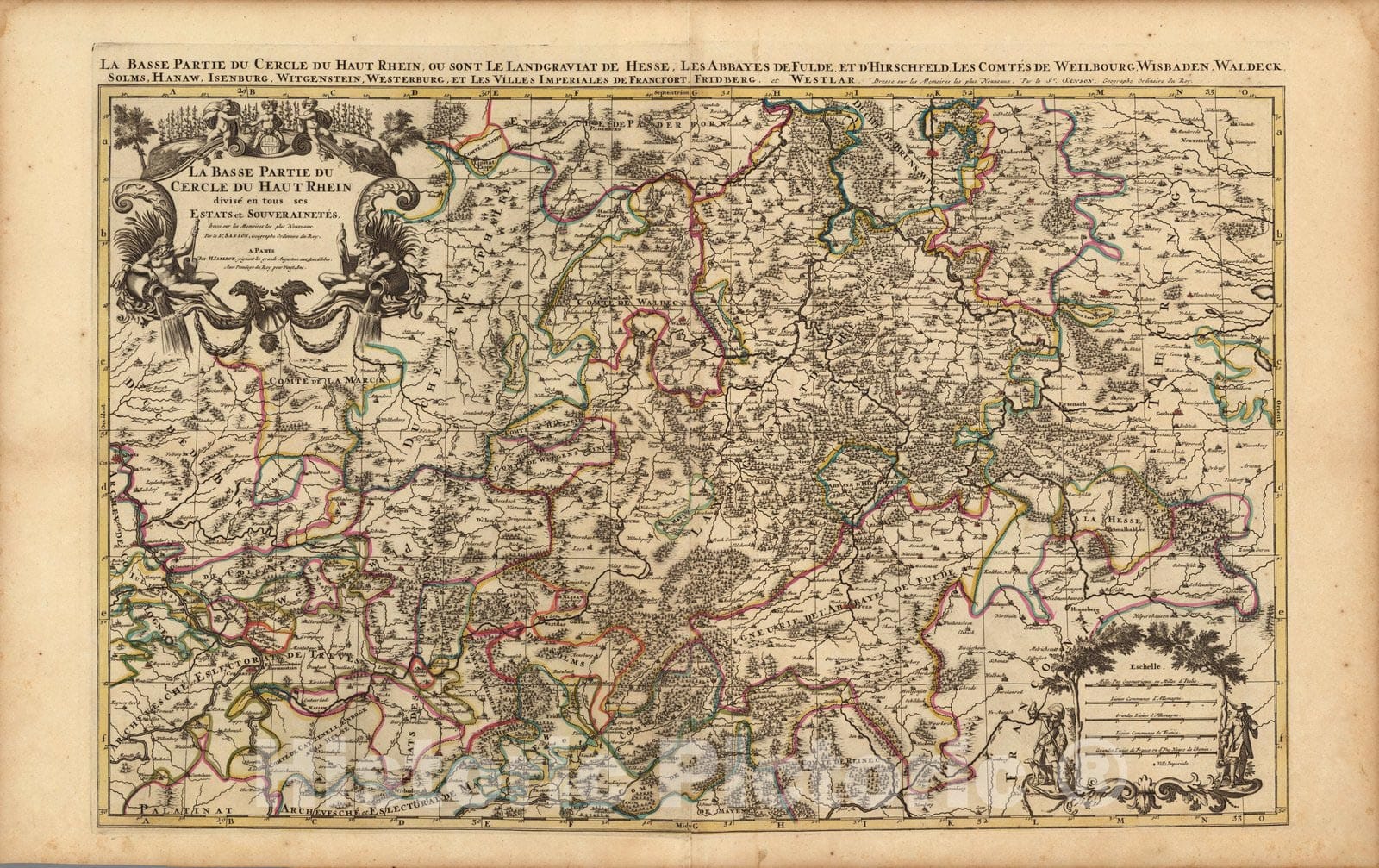La Basse Partie du Cercle du Haut Rhein. | Atlas Nouveau Contenant Toutes Les Parties du Monde, ou Sont exactement Remarques Les Empires, Monarchies, Royaumes, Estats, Republiques & Peuples qui fy trouuent a present. Par le Sr. Sanson, Geographe ordinaire du Roy. Presente a Monseigeur le Dauphin ... Hubert Jaillot Geographe du Roy. A Paris, Chez Hubert Jaillot .... | This issue of the Mortier/Jaillot Atlas Nouveau has 169 maps (1 more than the normal count of 168) plus diagrams, text pages, decorated titles and index pages. It is noted for the large number of multi-sheet "Theatre de la Guerre" (Theater of War) maps covering the battles raging in Europe and the Americas during the Spanish War of Succession (1701-1713) and the Northern War (1700-1721). The Atlas Nouveaux was first published by Jaillot in Paris in 1681(46 maps) with later issues by him in 1684 (72 maps) and 1689 (80 maps). In 1692 Pierre Mortier published his first edition of the Jaillot atlas with 99 maps, another edition followed in 1696 with 111 maps. In 1707/1708 Mortier issued our edition with 168 maps. Later editions by Mortier expanded the atlas even further - 1708, 200 maps; ca 1721, 300 maps; ca 1735, 400 maps. The atlas maps are large folio size with most maps made of two sheets and many maps combining 4 or 6 sheets (those also issued as wall maps separately). The atlas is most impressive for its large size and number of maps as well as being up to date for its time. This copy colored in outline with relief shown pictorially.