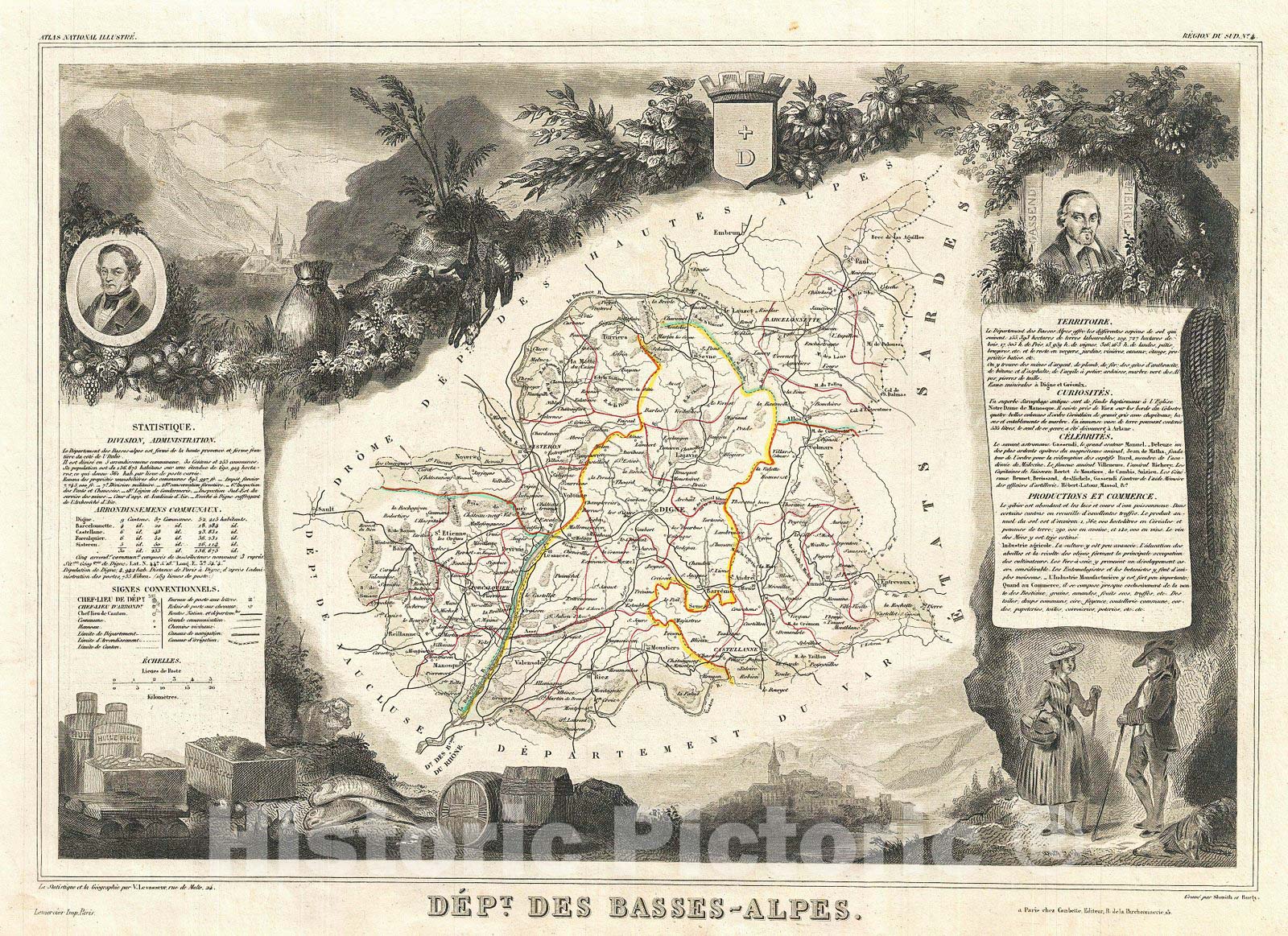 This is a fascinating 1857 map of the French department of Basses-Alpes, France. The whole is surrounded by elaborate decorative engravings designed to illustrate both the natural beauty and trade richness of the land. There is a short textual history of the regions depicted on both the left and right sides of the map. Published by V. Levasseur in the 1852 edition of his Atlas National de la France Illustree.