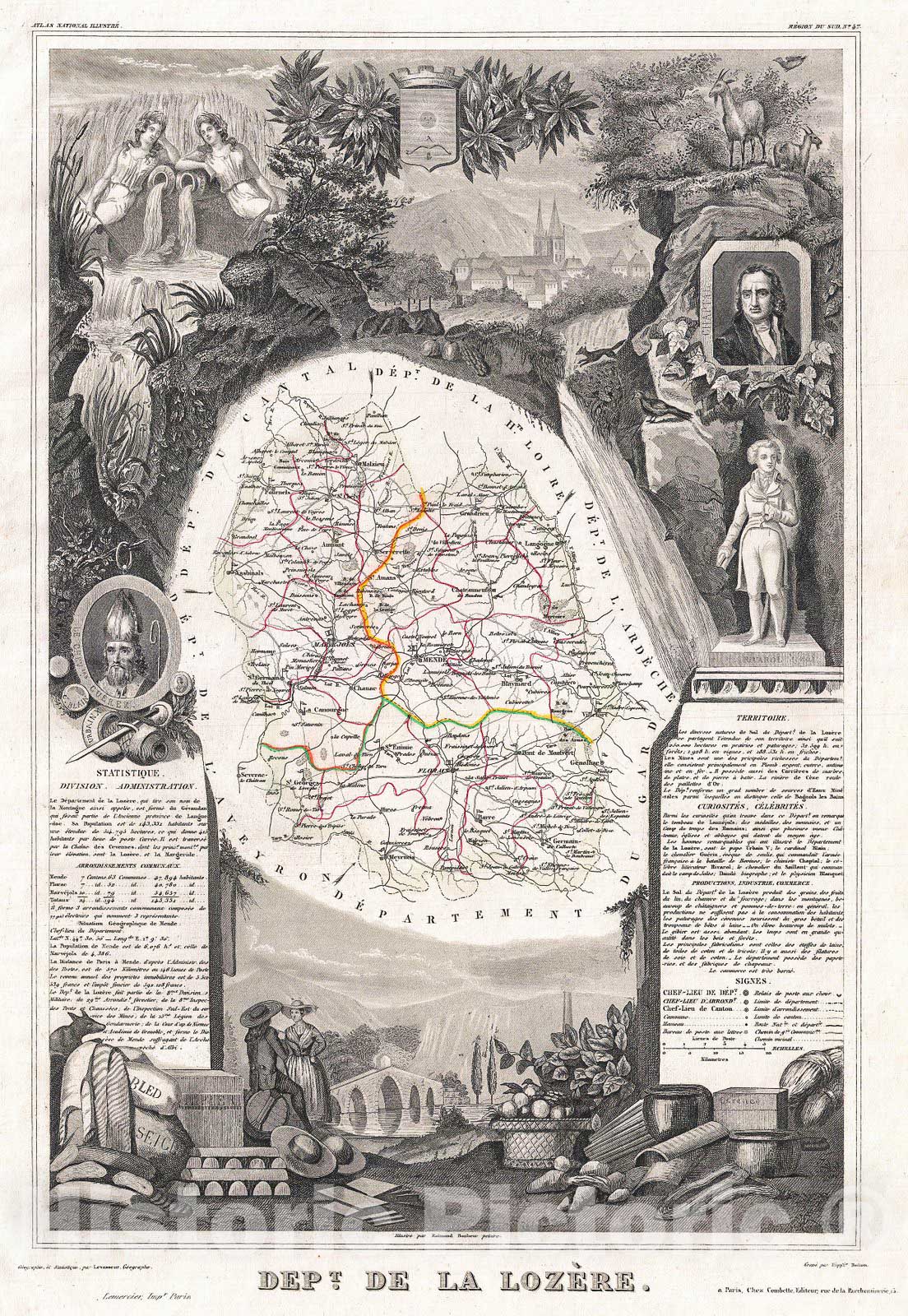 This is a fascinating 1852 map of the French department of Lozere, France. This remote mountainous part of Languedoc is rural, sparcely populated, and extremely beautiful. This area of France is famous for its cheese production. Their Roquefort, 'Bleu des Causses', and Tomme de Lozère varieties, for instance, are world-renowned. The Pilgrimage to Santiago de Compostella also passes through the northern part of this region. The map proper is surrounded by elaborate decorative engravings designed to illustrate both the natural beauty and trade richness of the land. There is a short textual history of the regions depicted on both the left and right sides of the map. Published by V. Levasseur in the 1852 edition of his Atlas National de la France Illustree.