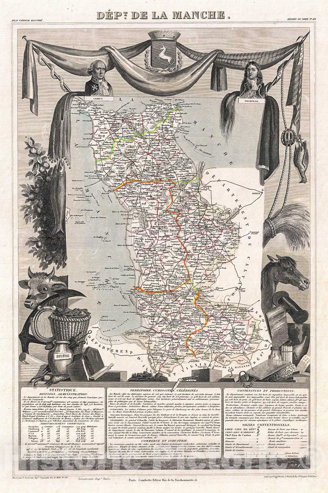 This is a fascinating 1852 map of the French department of Manche, France. This area is known for its production of Camembert, a soft, creamy, surface-ripened cow's milk cheese. The map proper is surrounded by elaborate decorative engravings designed to illustrate both the natural beauty and trade richness of the land. There is a short textual history of the regions depicted on the bottom of the map. Published by V. Levasseur in the 1852 edition of his Atlas National de la France Illustree.