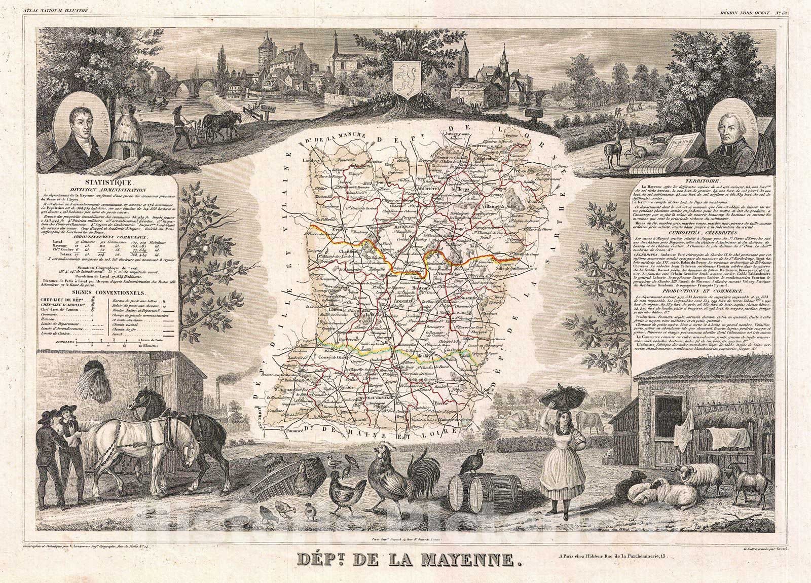 This is a fascinating 1852 map of the French department of Mayenne, France. This area is part of the Loire Valley wine region. The map proper is surrounded by elaborate decorative engravings designed to illustrate both the natural beauty and trade richness of the land. There is a short textual history of the regions depicted on both the left and right sides of the map. Published by V. Levasseur in the 1852 edition of his Atlas National de la France Illustree.