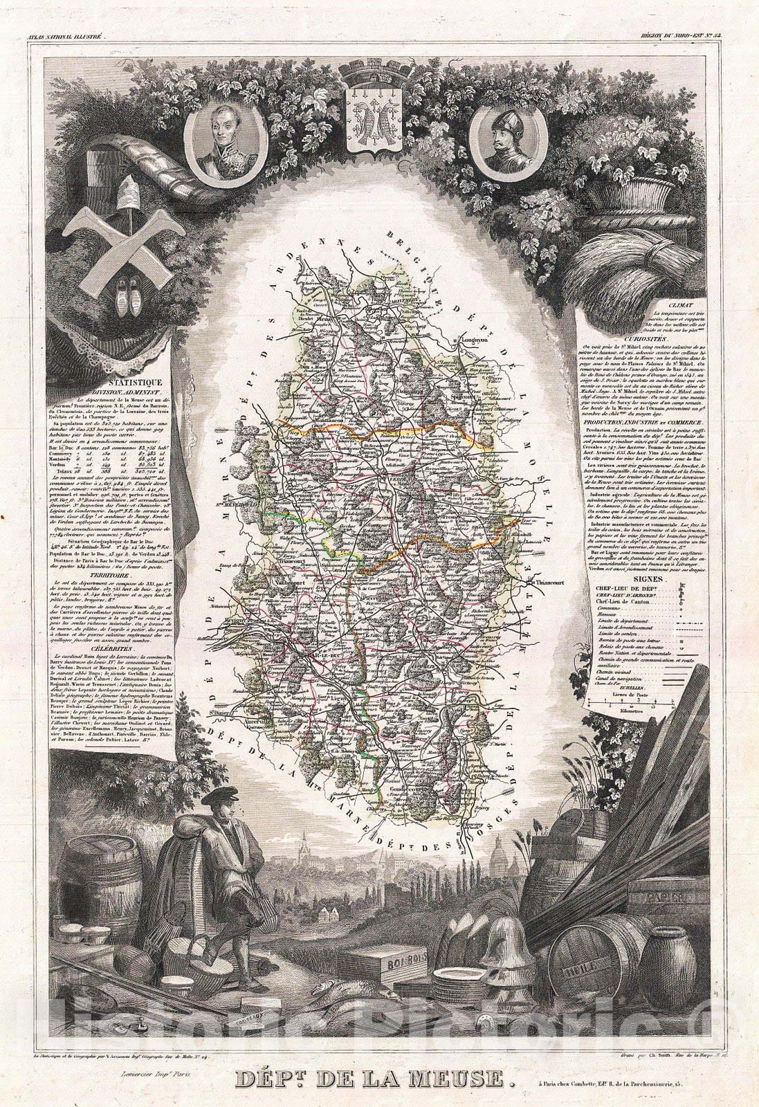 This is a fascinating 1852 map of the French department of Meuse, France. This area part of the Lorraine or Alsace-Lorraine wine regions. It is also known for its production of Brie de Meaux cheeses. In fact, more than 60% of Brie de Meaux production takes place in this region. The map proper is surrounded by elaborate decorative engravings designed to illustrate both the natural beauty and trade richness of the land. There is a short textual history of the regions depicted on both the left and right sides of the map. Published by V. Levasseur in the 1852 edition of his Atlas National de la France Illustree.