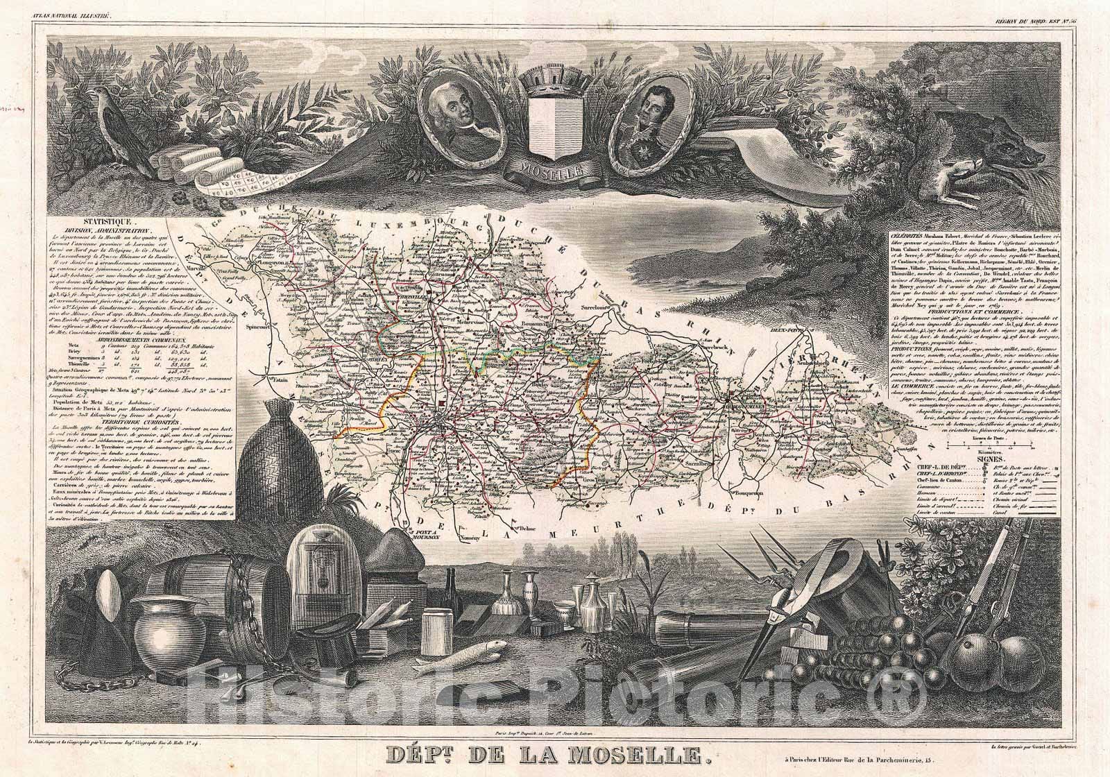 This is a fascinating 1852 map of the French department of Moselle, France. This area, part of the Alcase-Lorraine wine region, is known for its production of wines by the same name, the majority of which are white. The map proper is surrounded by elaborate decorative engravings designed to illustrate both the natural beauty and trade richness of the land. There is a short textual history of the regions depicted on both the left and right sides of the map. Published by V. Levasseur in the 1852 edition of his Atlas National de la France Illustree.