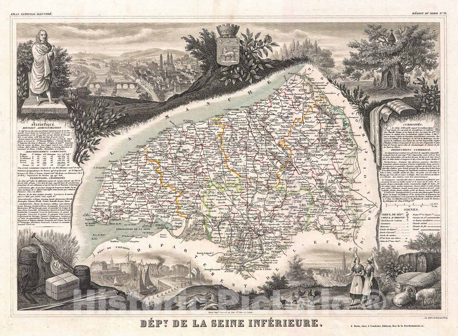 This is a fascinating 1852 map of the French department of Seine Inferieure, France. Centered around its capital of Rouen, this area is known for its production of Gournay, a soft cheese of the fresh Neufchatel type. The map proper is surrounded by elaborate decorative engravings designed to illustrate both the natural beauty and trade richness of the land. There is a short textual history of the regions depicted on both the left and right sides of the map. Published by V. Levasseur in the 1852 edition of his Atlas National de la France Illustree.