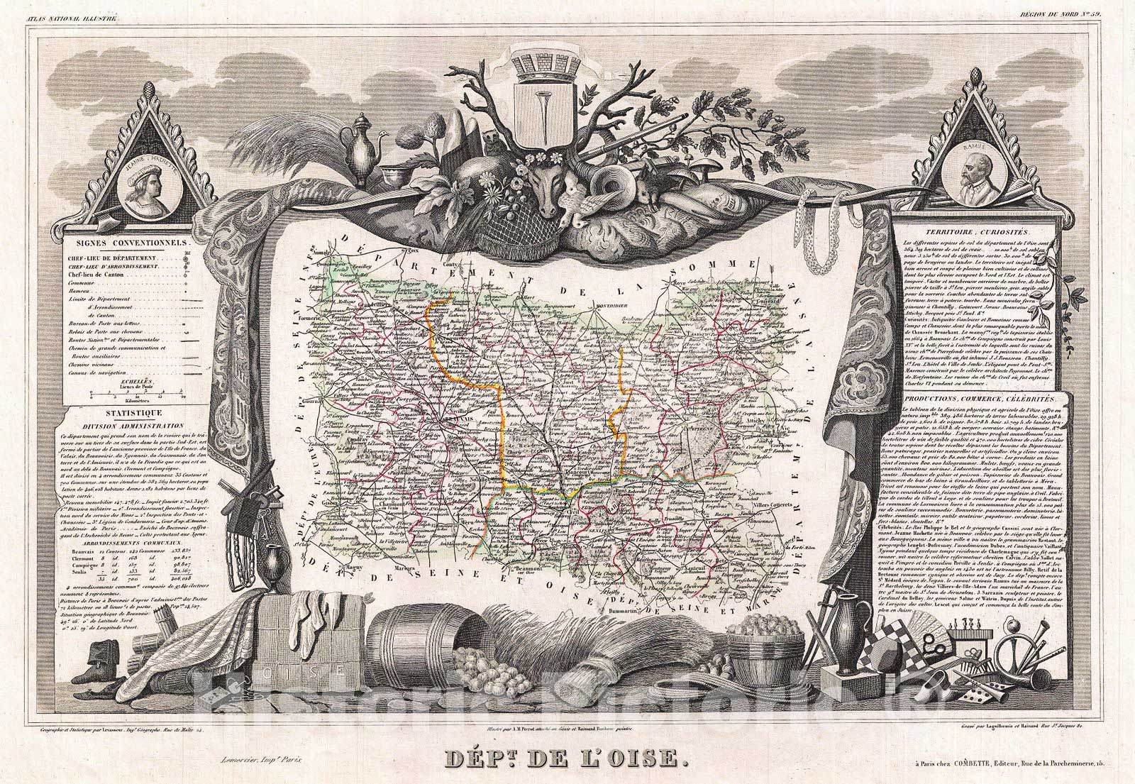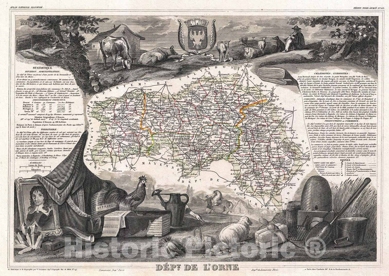 This is a fascinating 1852 map of the French department of Orne, France. This area, part of Normandy, includes the village of Camembert, where the famous Camembert cheese was first developed. Camembert is a soft, creamy, surface-ripened cow's milk cheese, similar to Brie. The map proper is surrounded by elaborate decorative engravings designed to illustrate both the natural beauty and trade richness of the land. There is a short textual history of the regions depicted on both the left and right sides of the map. Published by V. Levasseur in the 1852 edition of his Atlas National de la France Illustree.