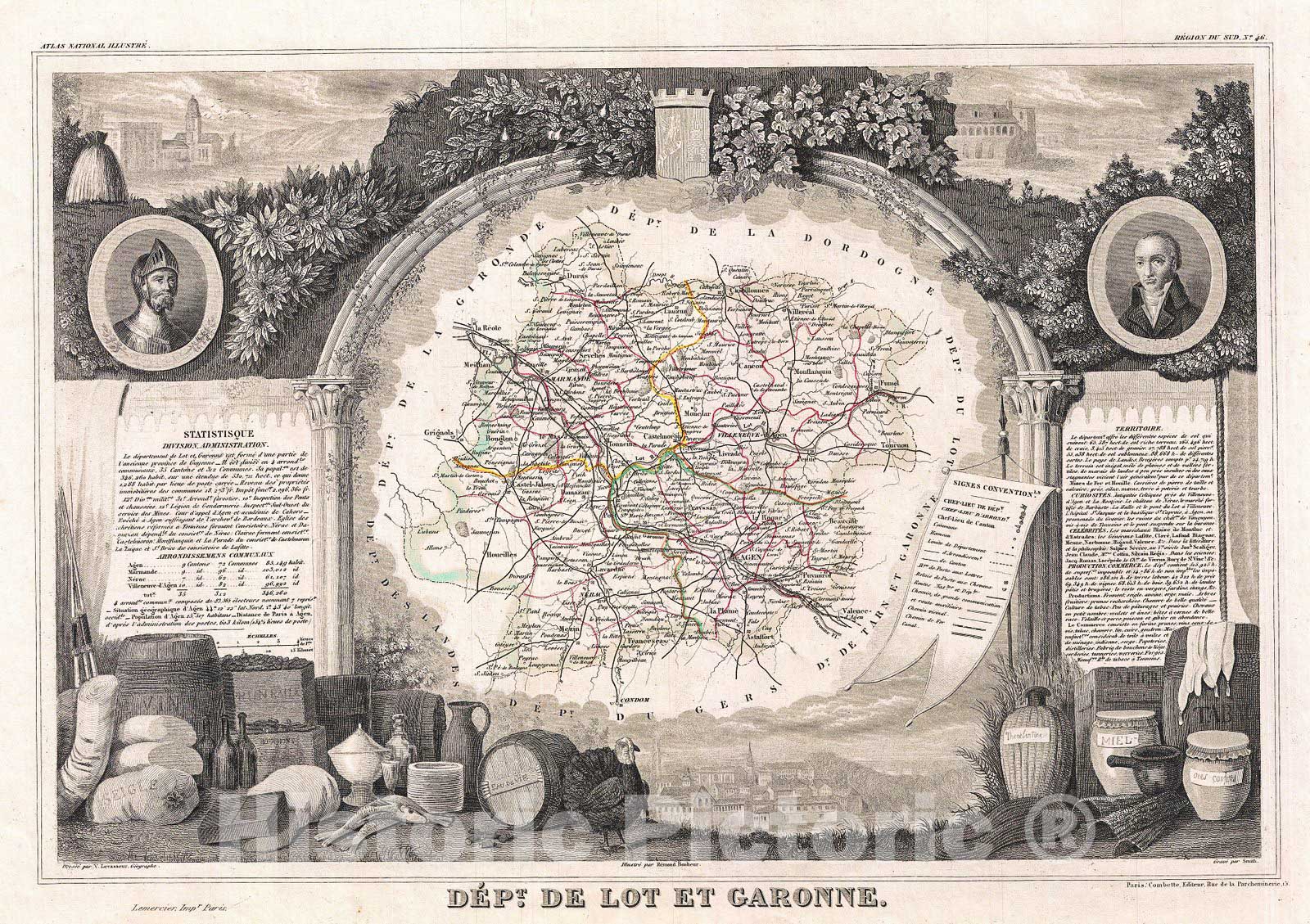 This is a fascinating 1852 map of the French department of Lot et Garonne, France. This area of France is known for its production of Buzet wines and Cabécou d'Antan, small round goat cheese with a fine, creamy texture. The Pilgrimage to Santiago de Compostella also passes through the northern part of this region. The map proper is surrounded by elaborate decorative engravings designed to illustrate both the natural beauty and trade richness of the land. There is a short textual history of the regions depicted on both the left and right sides of the map. Published by V. Levasseur in the 1852 edition of his Atlas National de la France Illustree.