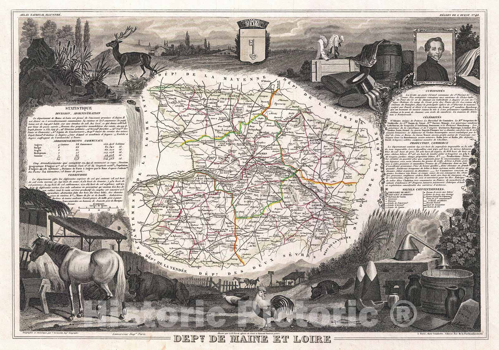This is a fascinating 1852 map of the French department of Maine et Loire, France. This area of France is part of the Loire Valley wine region, where nearly every wine imaginable is produced. Maine et Loire itself is home to the largest vineyard in the Loire Valley. It is also known for its production of Port-Salut, a distinctive, semi-soft cow's milk cheese. The map proper is surrounded by elaborate decorative engravings designed to illustrate both the natural beauty and trade richness of the land. There is a short textual history of the regions depicted on both the left and right sides of the map. Published by V. Levasseur in the 1852 edition of his Atlas National de la France Illustree.