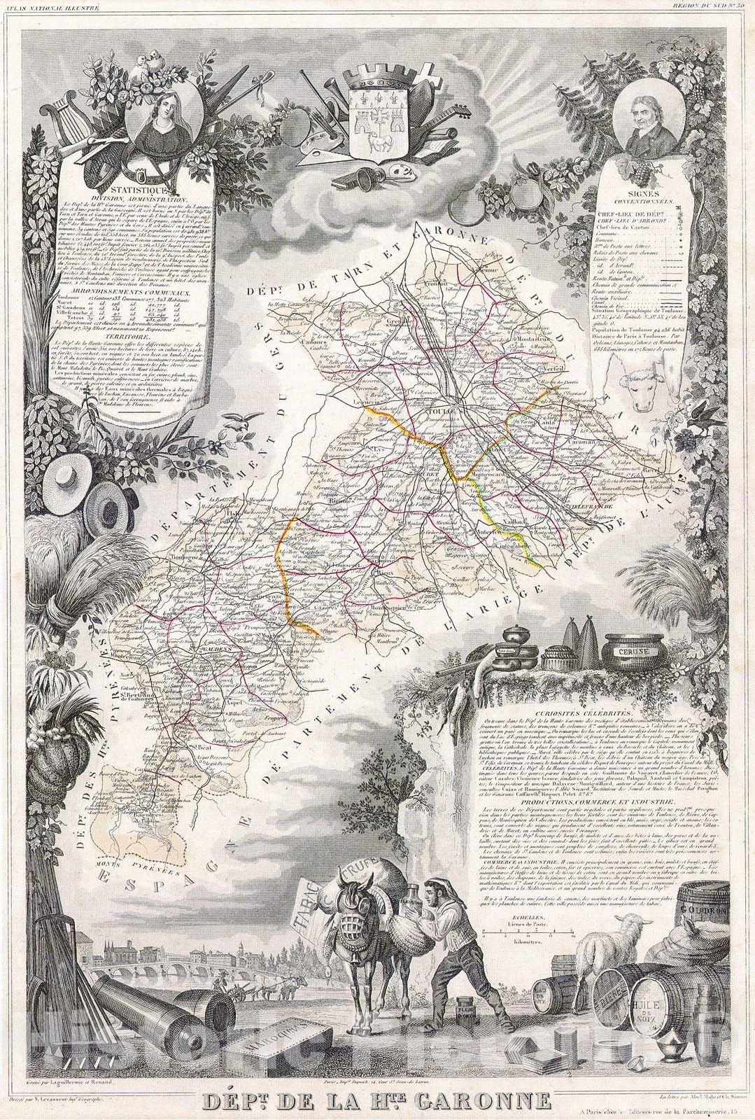 This is a fascinating 1847 map of the Department de la Haute Garonne, France. This region is known for its truffles, agriculture, distilled spirits, wines, and cheese. The capital is Toulouse. This region is also an important stop on the medieval pilgrimage route to Santiago de Compostella. The whole is surrounded by elaborate decorative engravings designed to illustrate both the natural beauty and trade richness of the land. There is a short textual history of the regions depicted on both the left and right sides of the map.