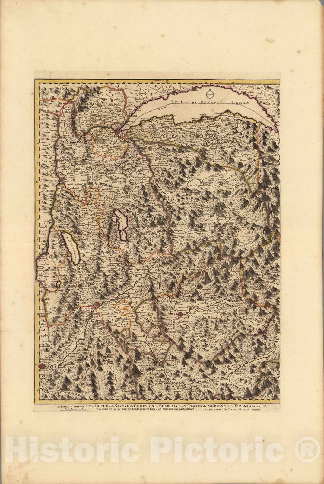Partie Contient les Duches de Savoye. | Atlas Nouveau Contenant Toutes Les Parties du Monde, ou Sont exactement Remarques Les Empires, Monarchies, Royaumes, Estats, Republiques & Peuples qui fy trouuent a present. Par le Sr. Sanson, Geographe ordinaire du Roy. Presente a Monseigeur le Dauphin ... Hubert Jaillot Geographe du Roy. A Paris, Chez Hubert Jaillot .... | This issue of the Mortier/Jaillot Atlas Nouveau has 169 maps (1 more than the normal count of 168) plus diagrams, text pages, decorated titles and index pages. It is noted for the large number of multi-sheet "Theatre de la Guerre" (Theater of War) maps covering the battles raging in Europe and the Americas during the Spanish War of Succession (1701-1713) and the Northern War (1700-1721). The Atlas Nouveaux was first published by Jaillot in Paris in 1681(46 maps) with later issues by him in 1684 (72 maps) and 1689 (80 maps). In 1692 Pierre Mortier published his first edition of the Jaillot atlas with 99 maps, another edition followed in 1696 with 111 maps. In 1707/1708 Mortier issued our edition with 168 maps. Later editions by Mortier expanded the atlas even further - 1708, 200 maps; ca 1721, 300 maps; ca 1735, 400 maps. The atlas maps are large folio size with most maps made of two sheets and many maps combining 4 or 6 sheets (those also issued as wall maps separately). The atlas is most impressive for its large size and number of maps as well as being up to date for its time. This copy colored in outline with relief shown pictorially.